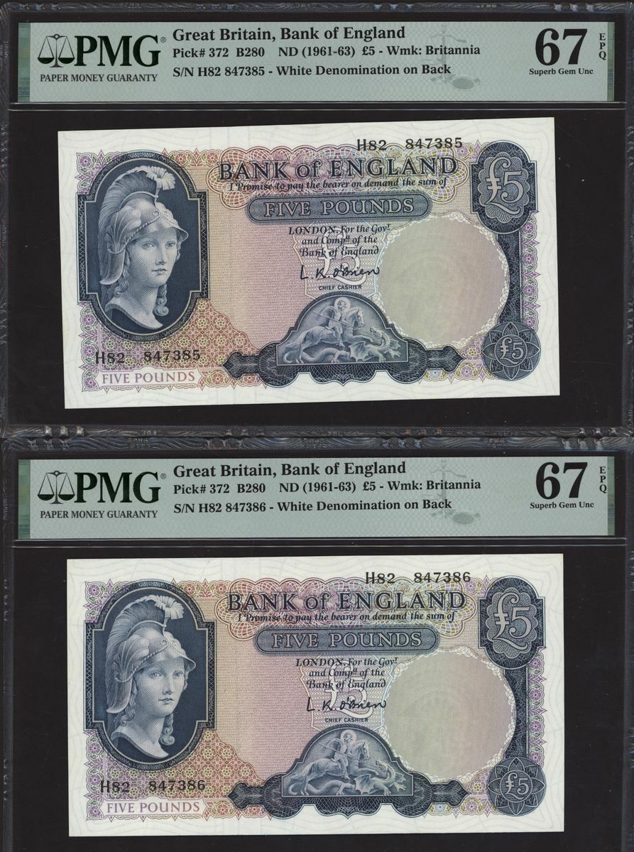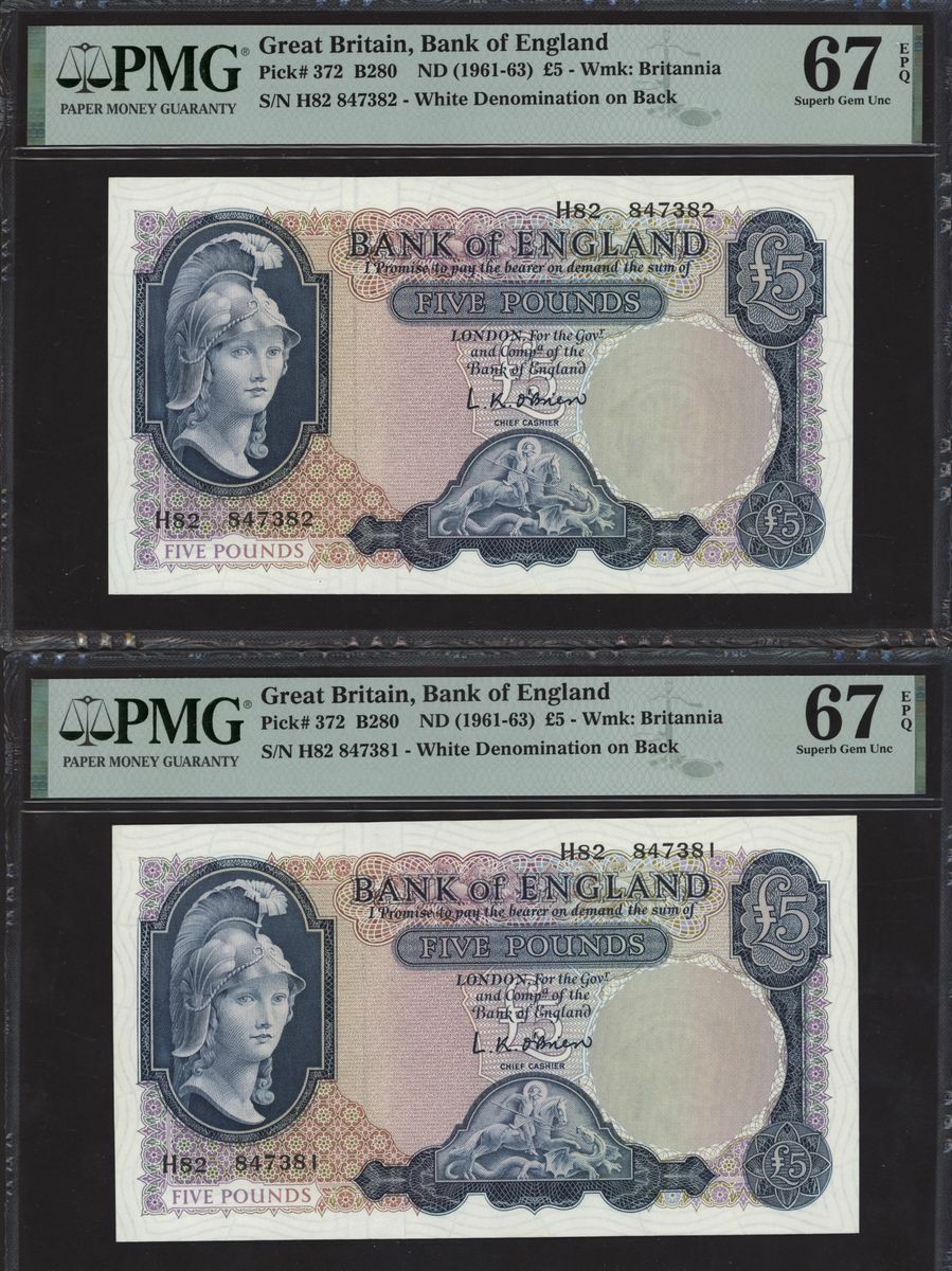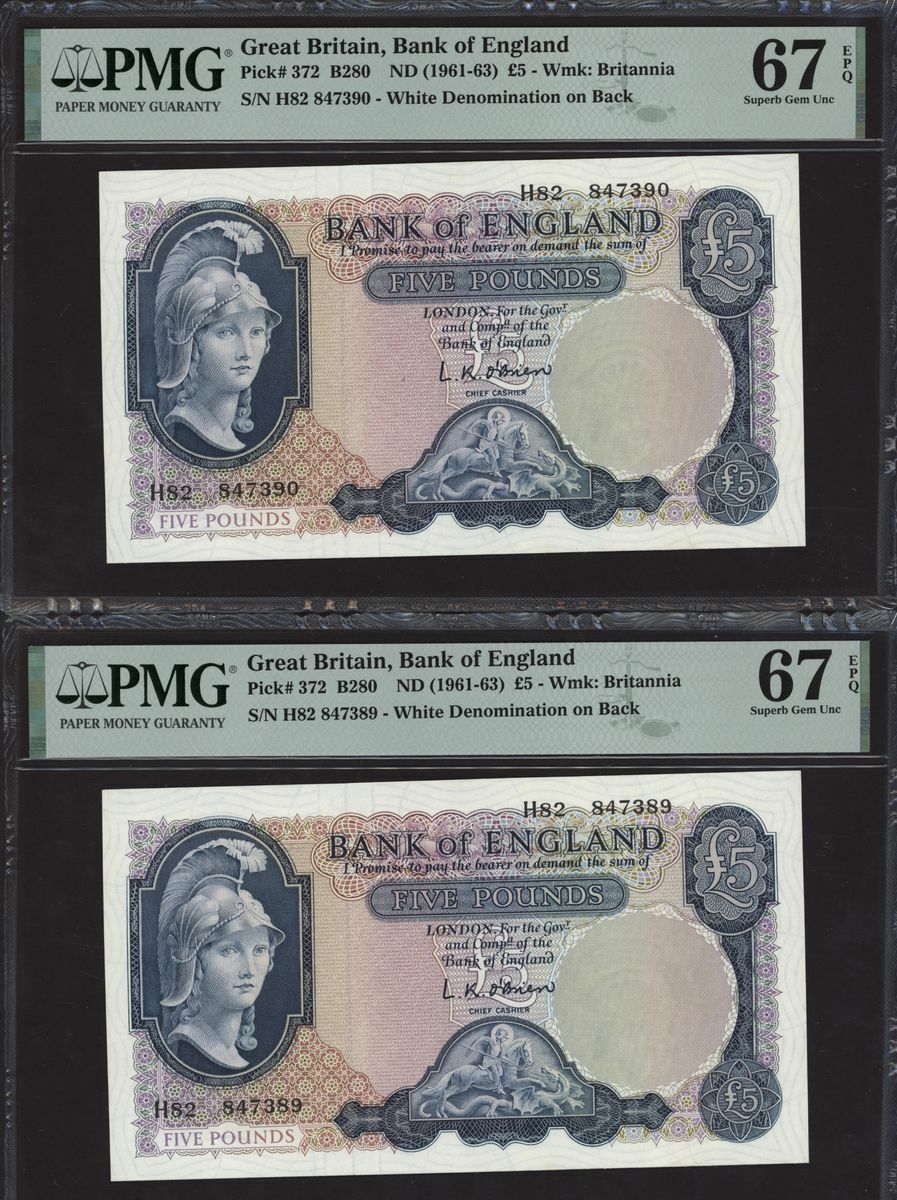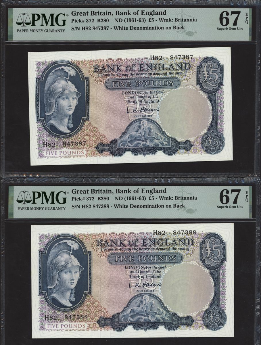 Bank of England, L. K. O'Brien, consecutive group of £5, ND (1961-63), serial numbers H82 847381-90, (EPM B280, Pick 372), in PMG holders 67 EPQ Superb Gem Uncirculated