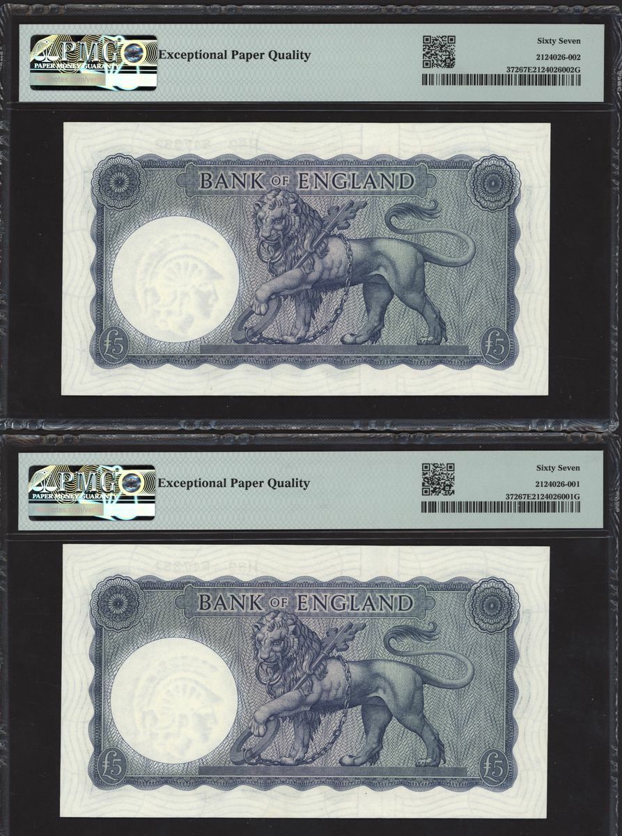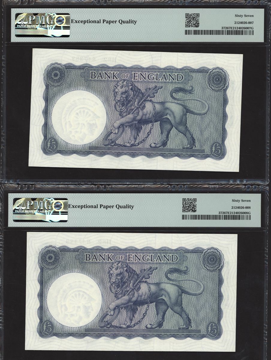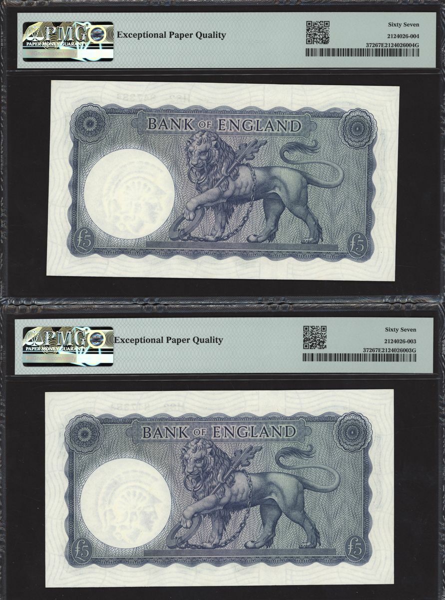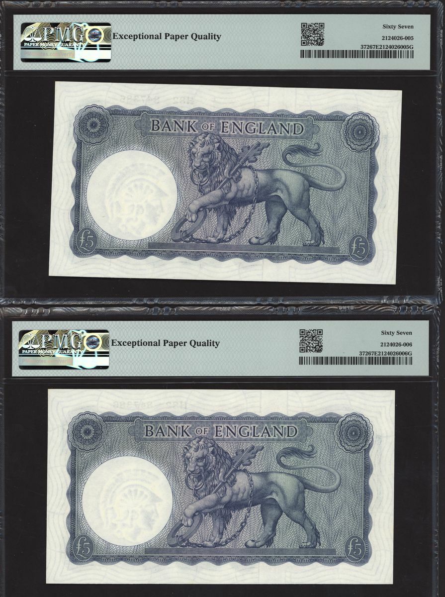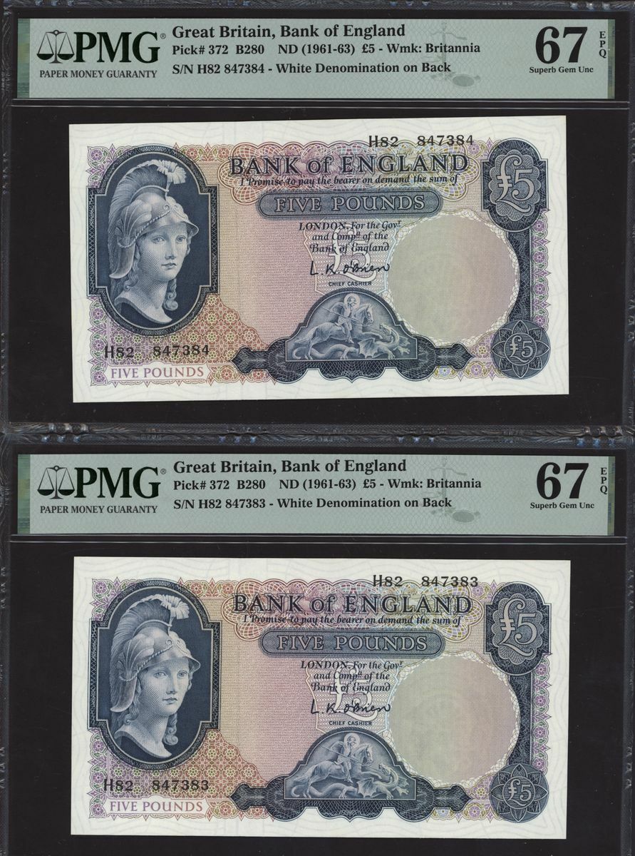 Bank of England, L. K. O'Brien, consecutive group of £5, ND (1961-63), serial numbers H82 847381-90, (EPM B280, Pick 372), in PMG holders 67 EPQ Superb Gem Uncirculated
