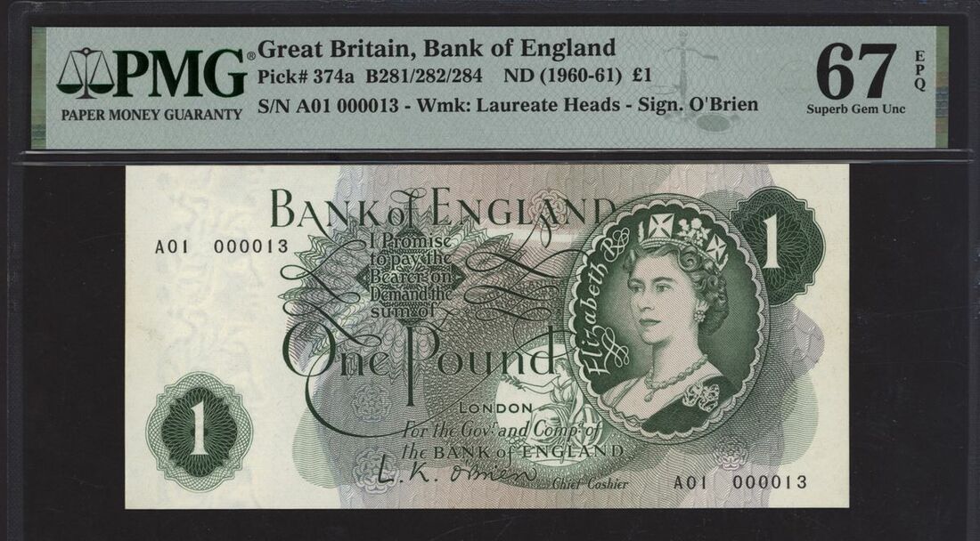 Bank of England, L. K. O'Brien, [Top Pop] £1, ND (1960-61), serial number A01 000013, (EPM B281, Pick 374a), in PMG holder 67 EPQ Superb Gem Uncirculated