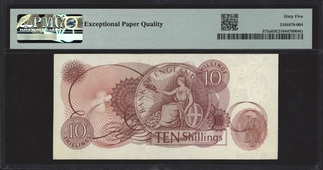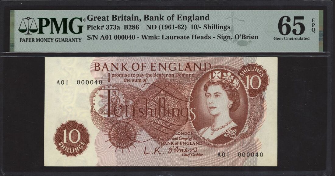 Bank of England, L. K. O'Brien, 10 shillings, ND (1961-62), serial number A01 000040, (EPM B286, Pick 373a), in PMG holder 65 EPQ Gem Uncirculated