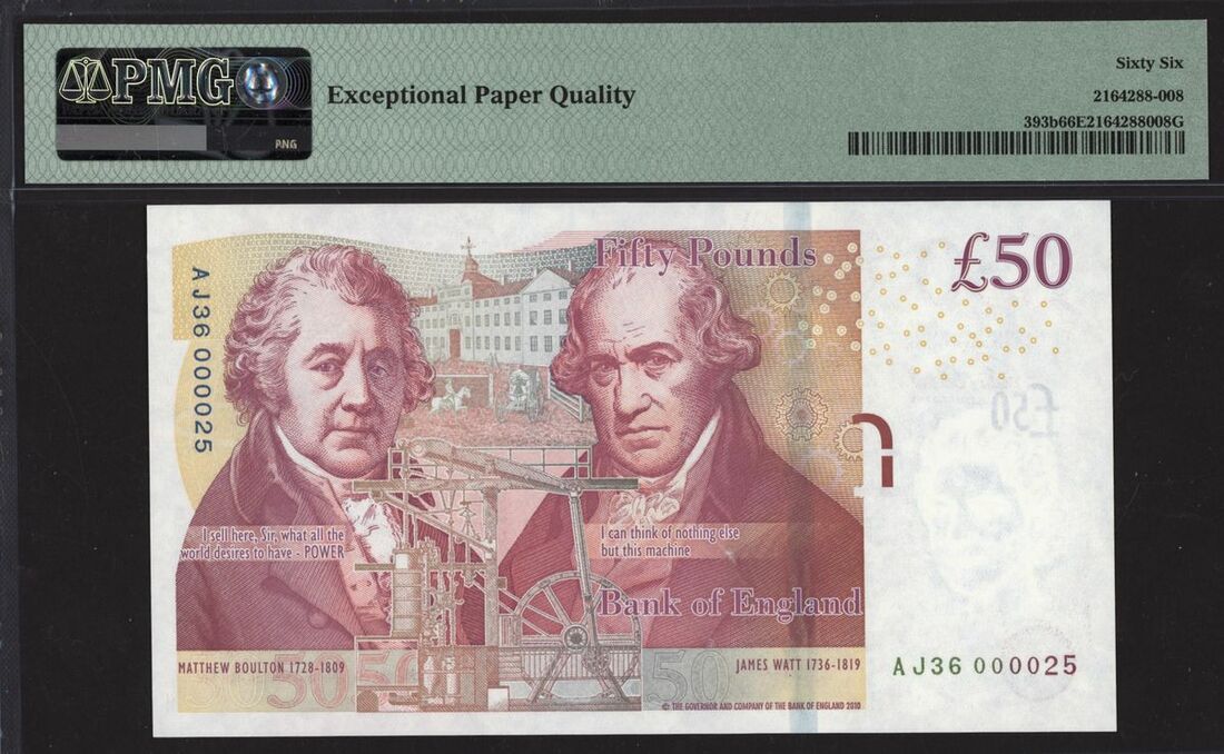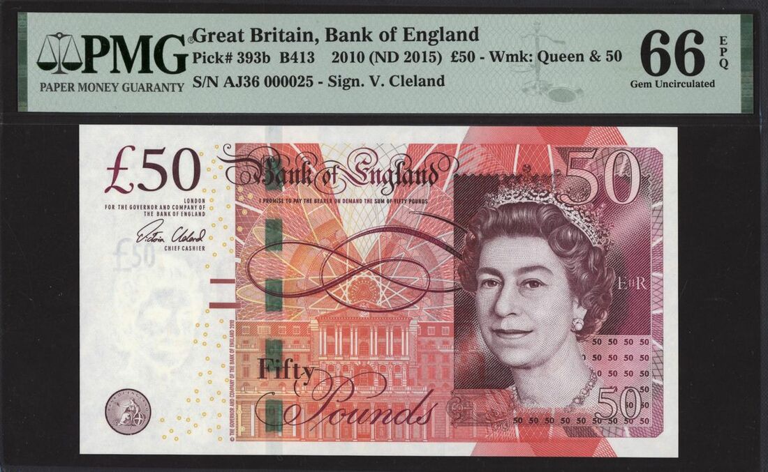 Bank of England, V. M. F. Cleland, £50, 2010 (ND 2015), serial number AJ36 000025, (EPM B413, Pick 393b), in PMG holder EPQ 66 Gem Uncirculated