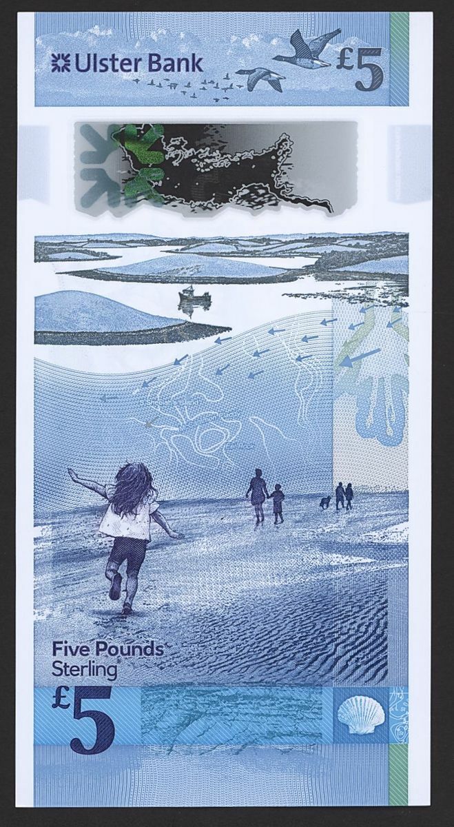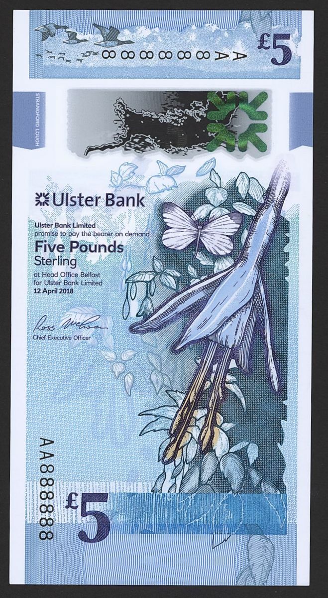 Ulster Bank, Northern Ireland, polymer £5, 12th April 2018, serial number AA888888, blue, fuchsia flowers and a butterfly, brent geese at left, outline of Strangford Lough in transparent window, reverse depiction of sea currents and families walking along a beach