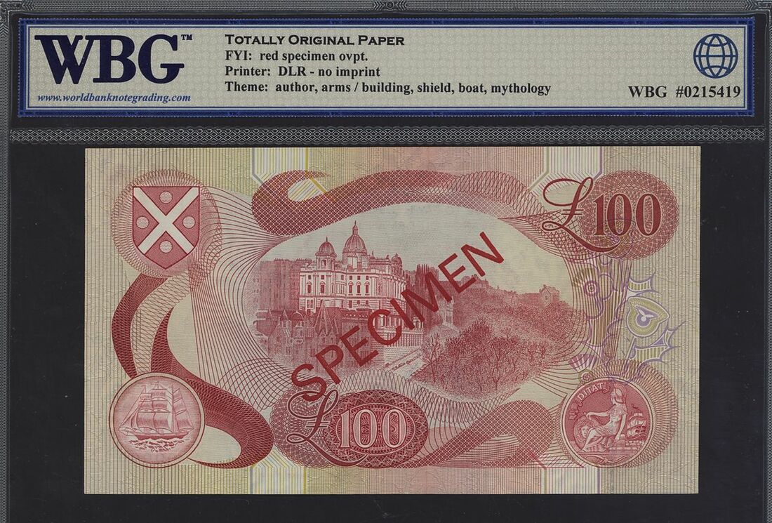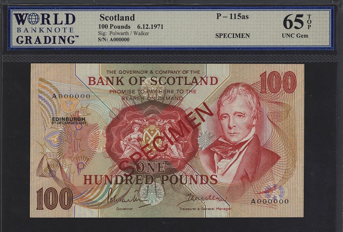 (x) Bank of Scotland, specimen £100, 6th December 1971, serial number A000000, (PMS BA120a, Pick 115as), in WBG holder 65 TOP Uncirculated Gem