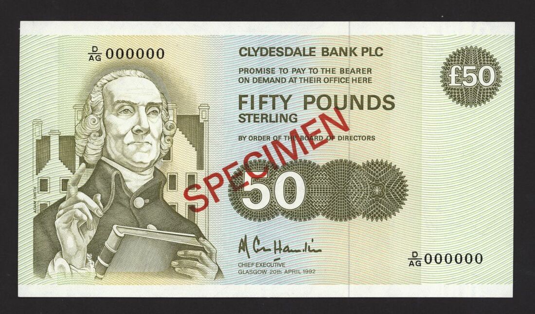 (x) Clydesdale Bank Plc, Scotland, specimen £50, 20th April 1992, serial number D/AG 000000, (PMS CL46, Pick 222s, BNB 1148), red SPECIMEN overprints, uncirculated, quite scarce