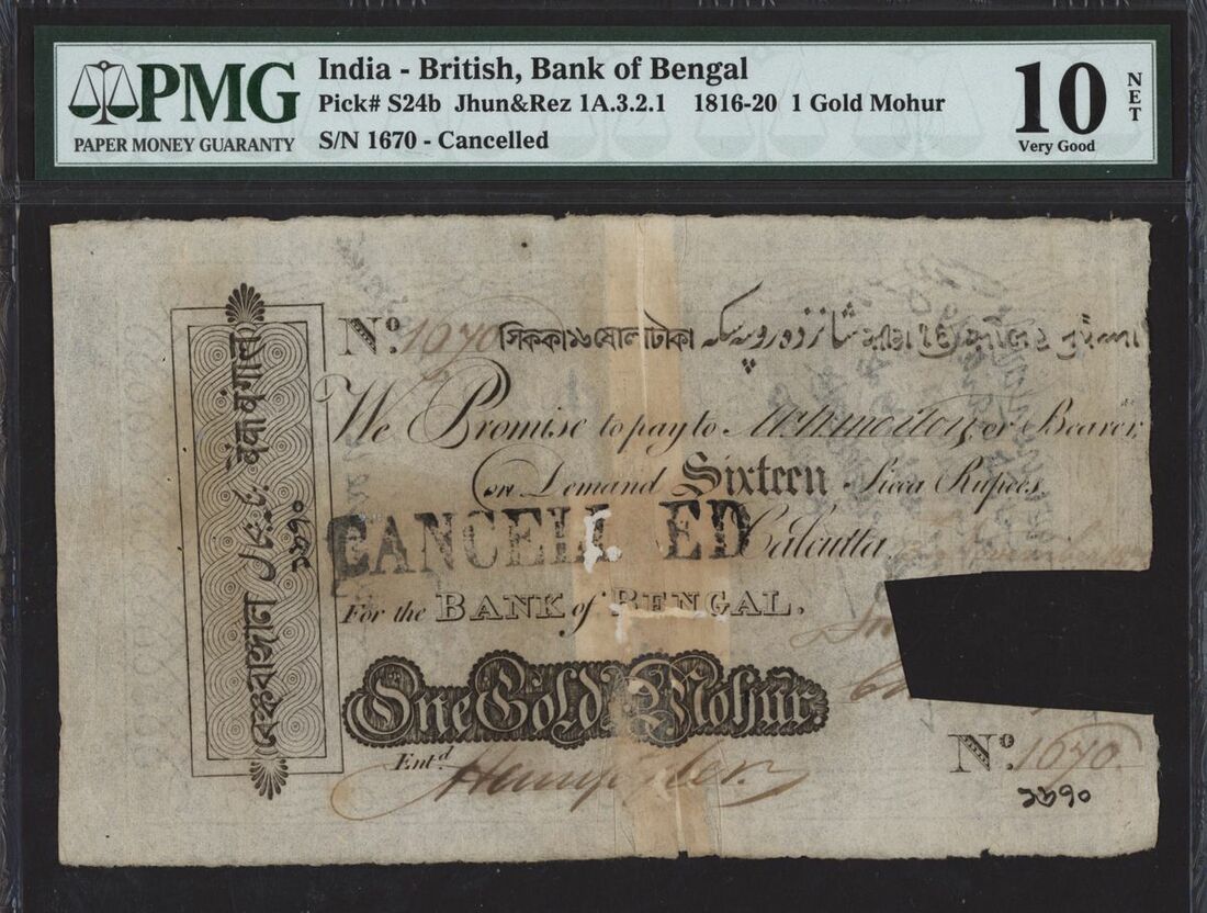 (x) Bank of Bengal, India, 1 Gold Mohur / 16 Sicca Rupees, 1816-20, serial number 1670, (Pick S24b, Razack-Jhunjhunwalla 1A.3.2.1), in PMG holder 10 NET Very Good, reattached at centre, annotations. Very scarce early issue