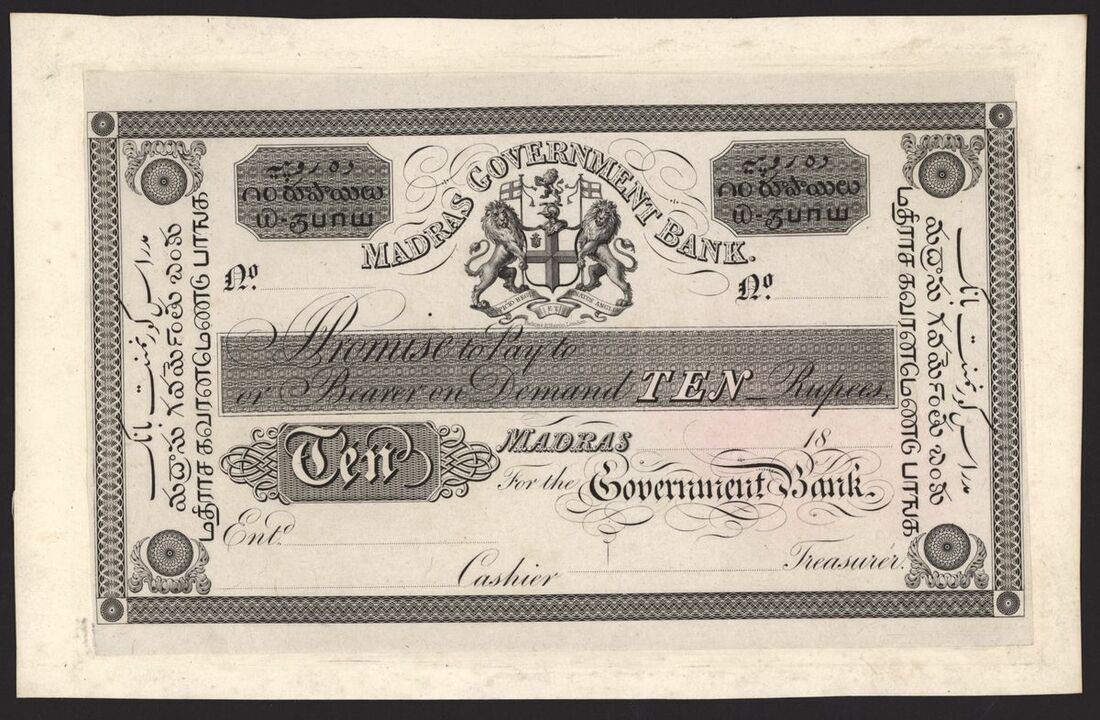 Madras Government Bank, India, Perkins & Bacon proof, 10 rupees, 18--, (Pick unlisted), Madras government pattern established 1806, stuck on card, good extremely fine or better, rare