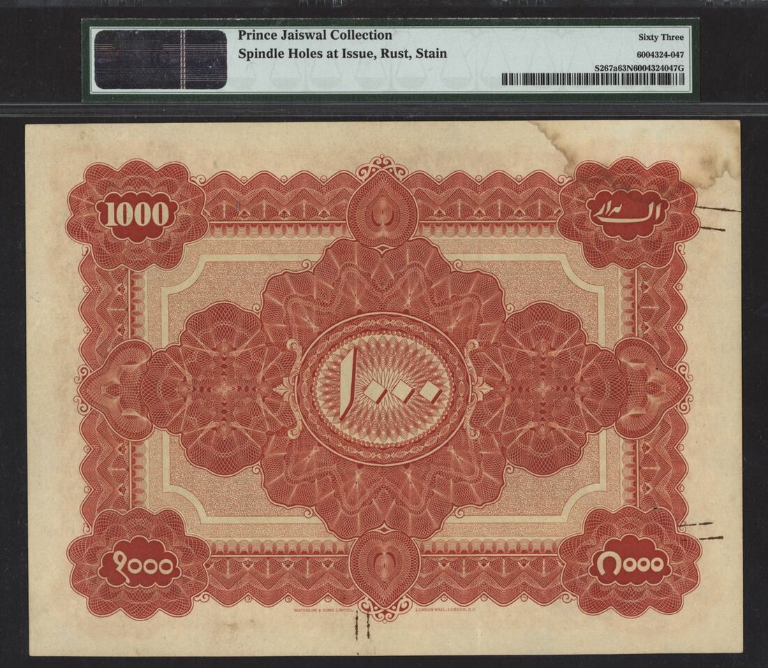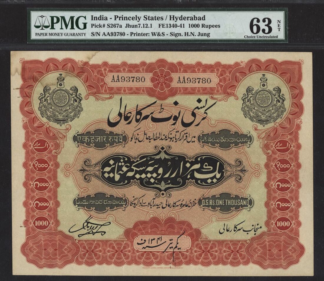 Princely States / Hyderabad, India, 1000 Rupees, ND (1929-30), serial number AA93780, (Pick S267a, Razack-Jhunjhunwalla 7.12.1), in PMG holder 63 NET Choice Uncirculated, Price Jaiswal Collection, spindle holes at issue, rust, stain, iconic Princely States note, scarce