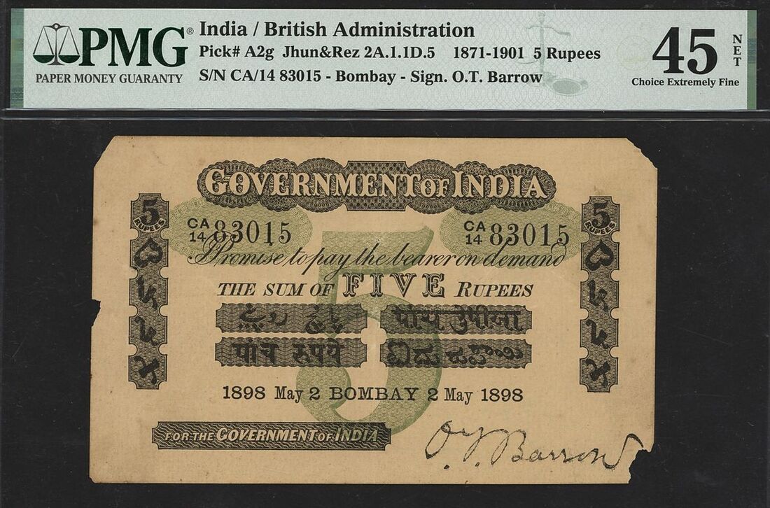 (x) Government of India, 5 rupees, 2nd May 1898, serial number CA/14 83015, Bombay Circle