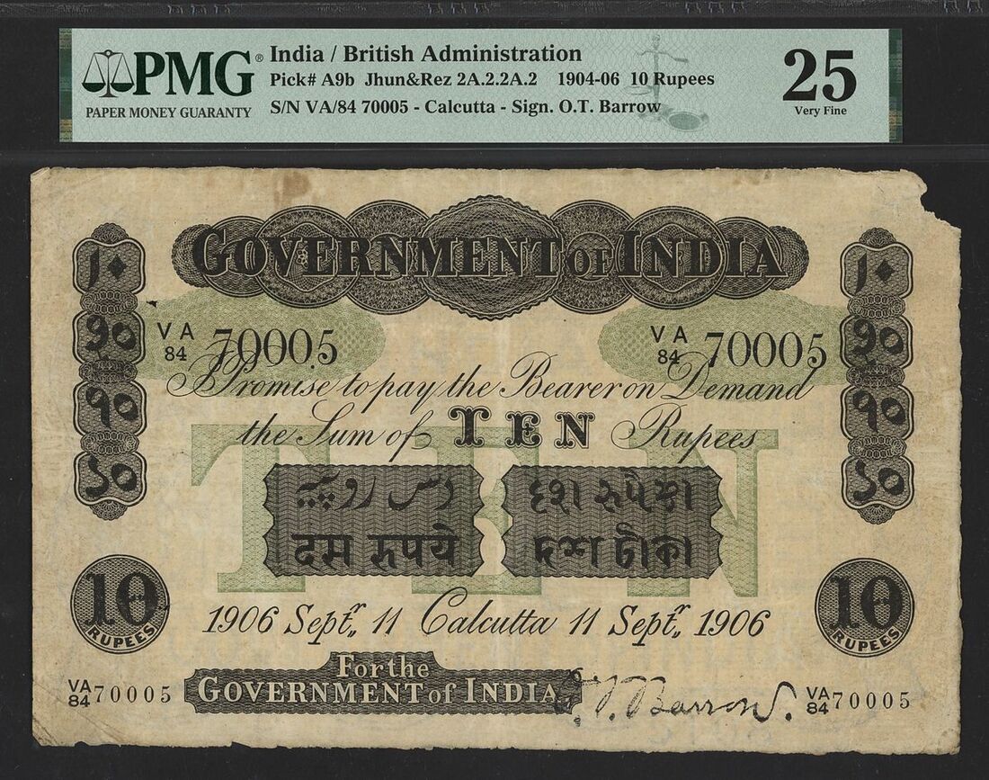 (x) Government of India, 10 rupees, 11th September 1906, serial number VA 84 70005, (Pick A9b, Razack-Jhunjhunwalla 2A.2.2A.2, BNB 113), in PMG holder 25 Very Fine, spindle holes at issue, corner missing, only 4 notes in a higher grade