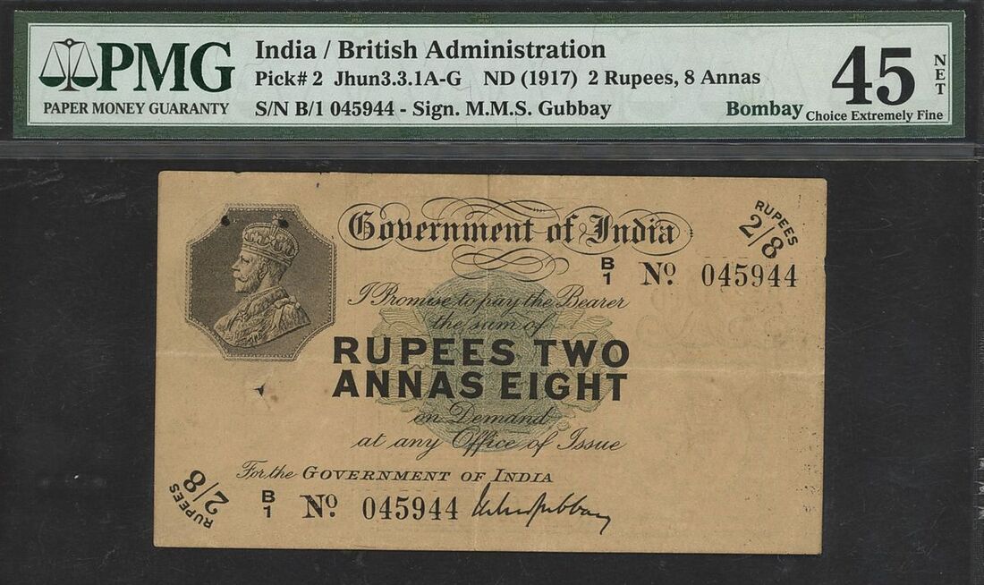 (x) Government of India, 2 rupees, 8 annas, ND (1917), serial number B/1 045944, Bombay Circle