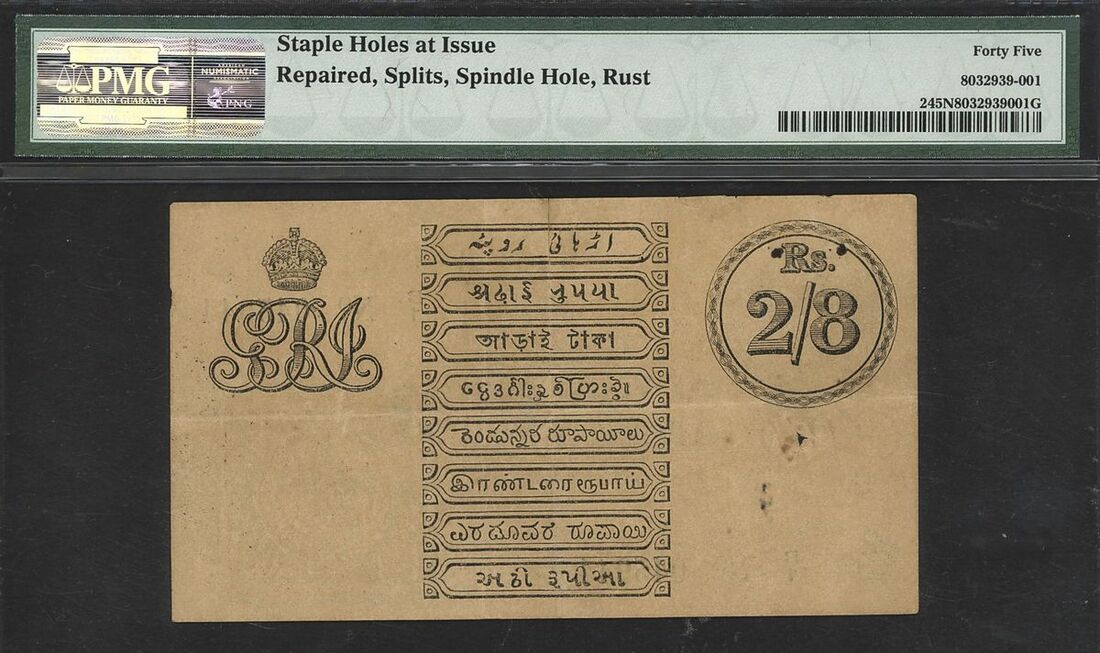 (Pick 2, Razack-Jhunjhunwalla 3.3.1A-G), in PMG holder 45 NET Choice Extremely Fine, staple holes at issue, repaired, spindle hole, rust