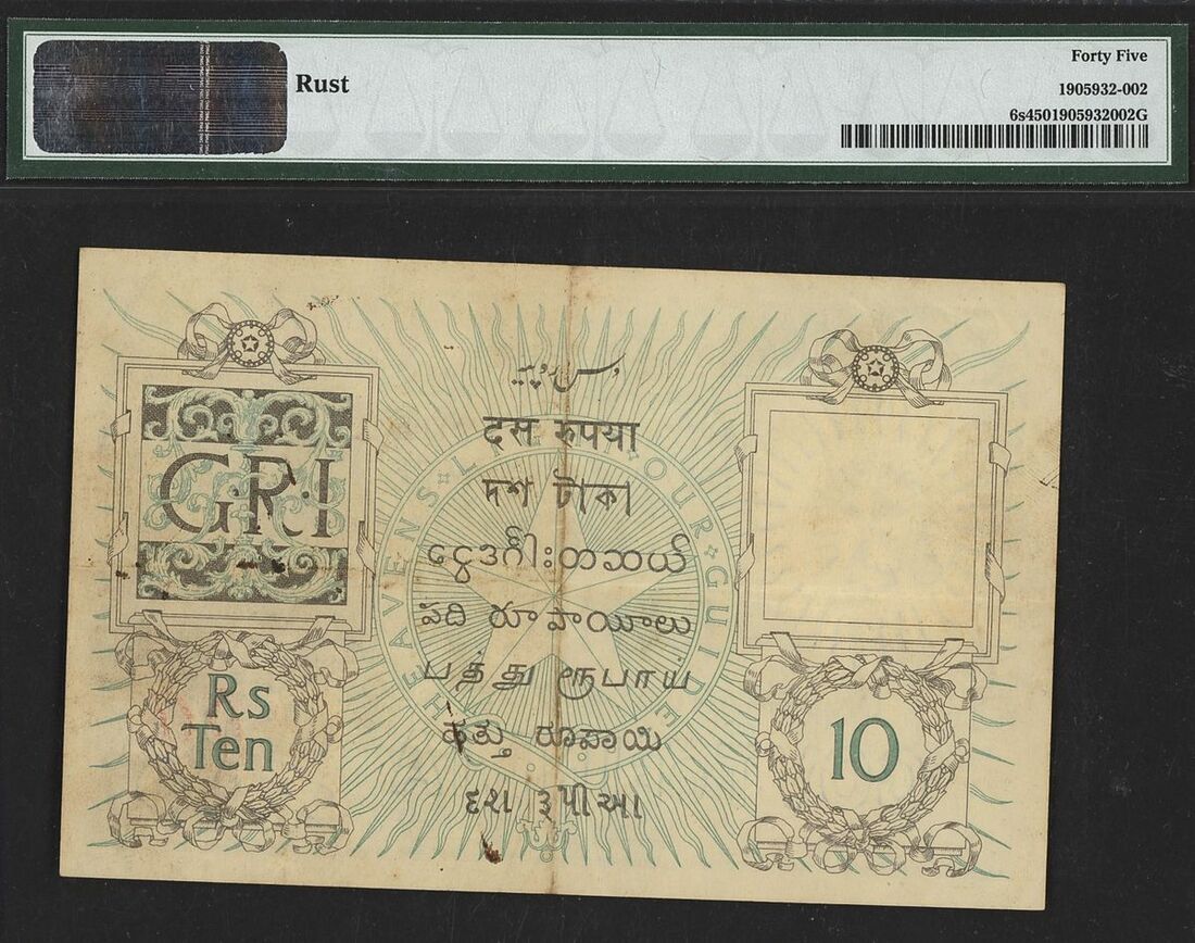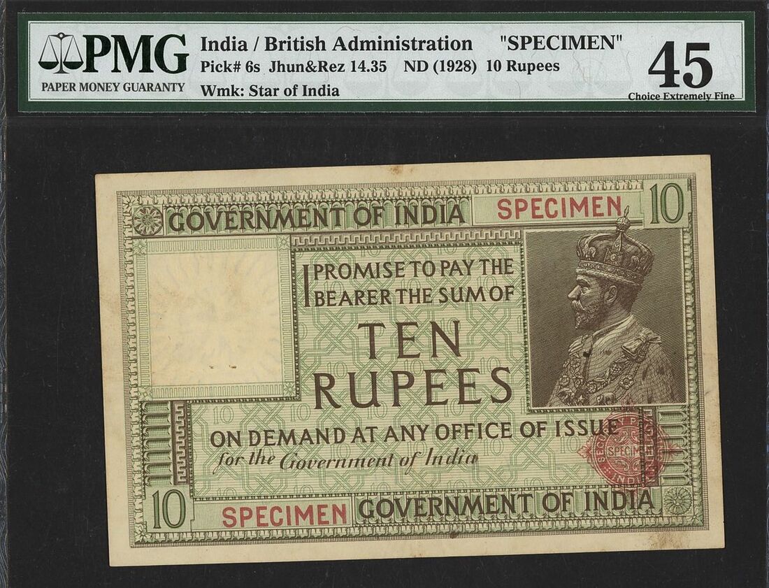 (x) Government of India, specimen 10 rupees, ND (1928), (Pick 6s, Razack-Jhunjhunwalla 14.35, BNB 140s), in PMG holder 45 Choice Extremely Fine