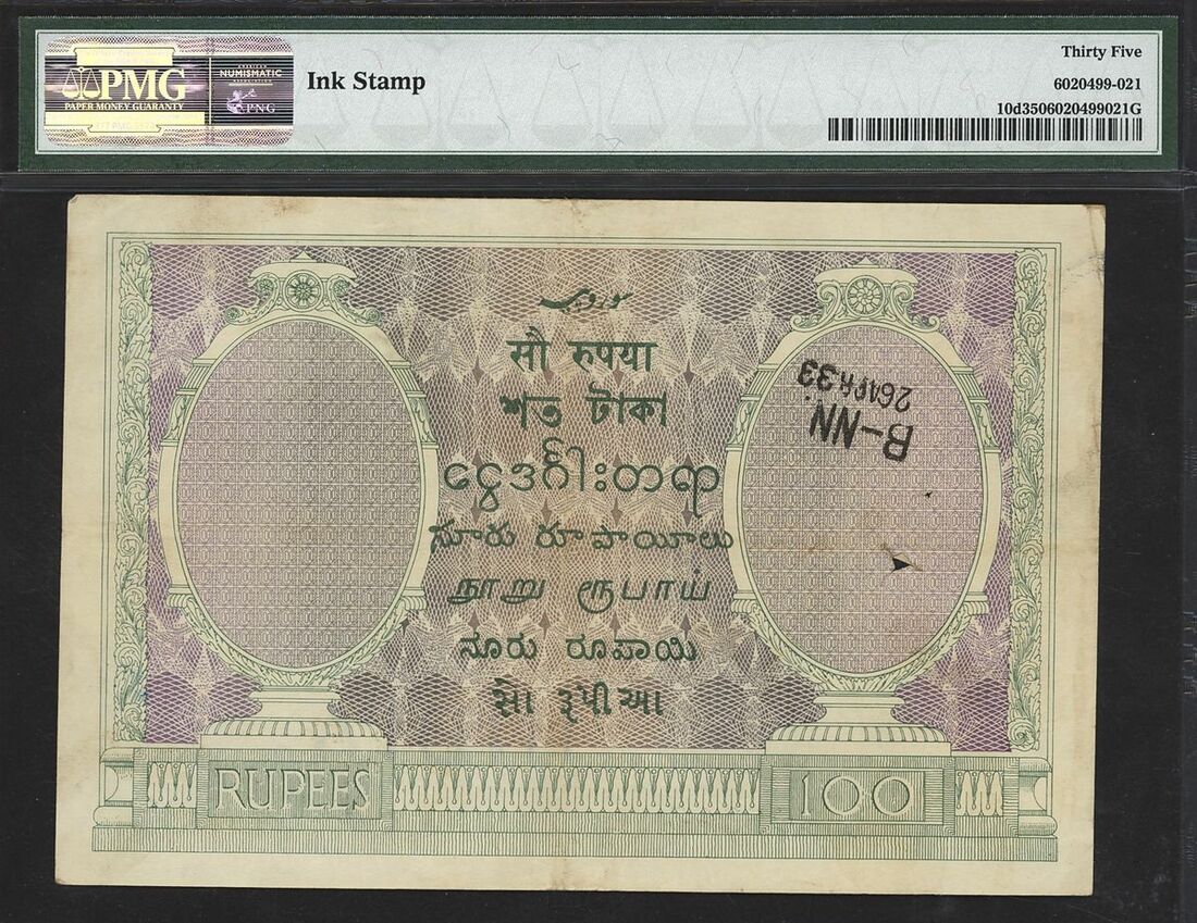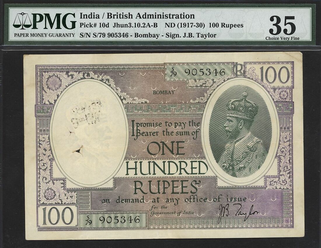 (x) Government of India, 100 rupees, ND (1917-30), S/79 905346 (Pick 10d, Razack-Jhunjhunwalla 4.8.1D, BNB 144), in PMG holder 35 Choice Very Fine, ink stamp, Bombay issue