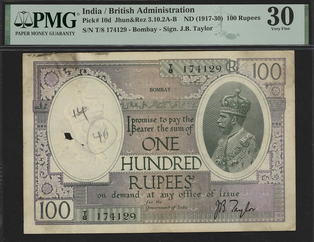 (x) Government of India, 100 rupees, Bombay, ND (1917-30), serial number T/8 174129, King George V at right