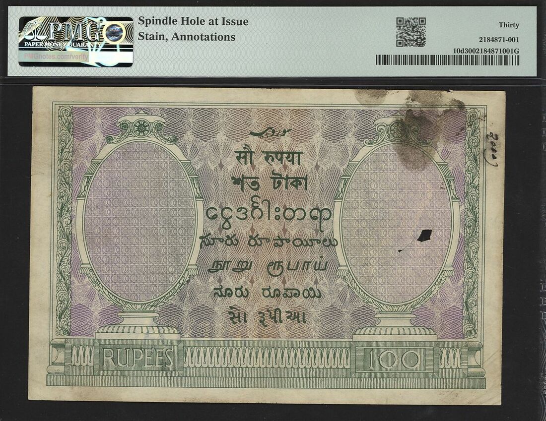 (Pick 10d, Razack-Jhunjhunwalla 3.10.3A-B), in PMG holder 30 Very Fine, spindle hole at issue, stain, annotations
