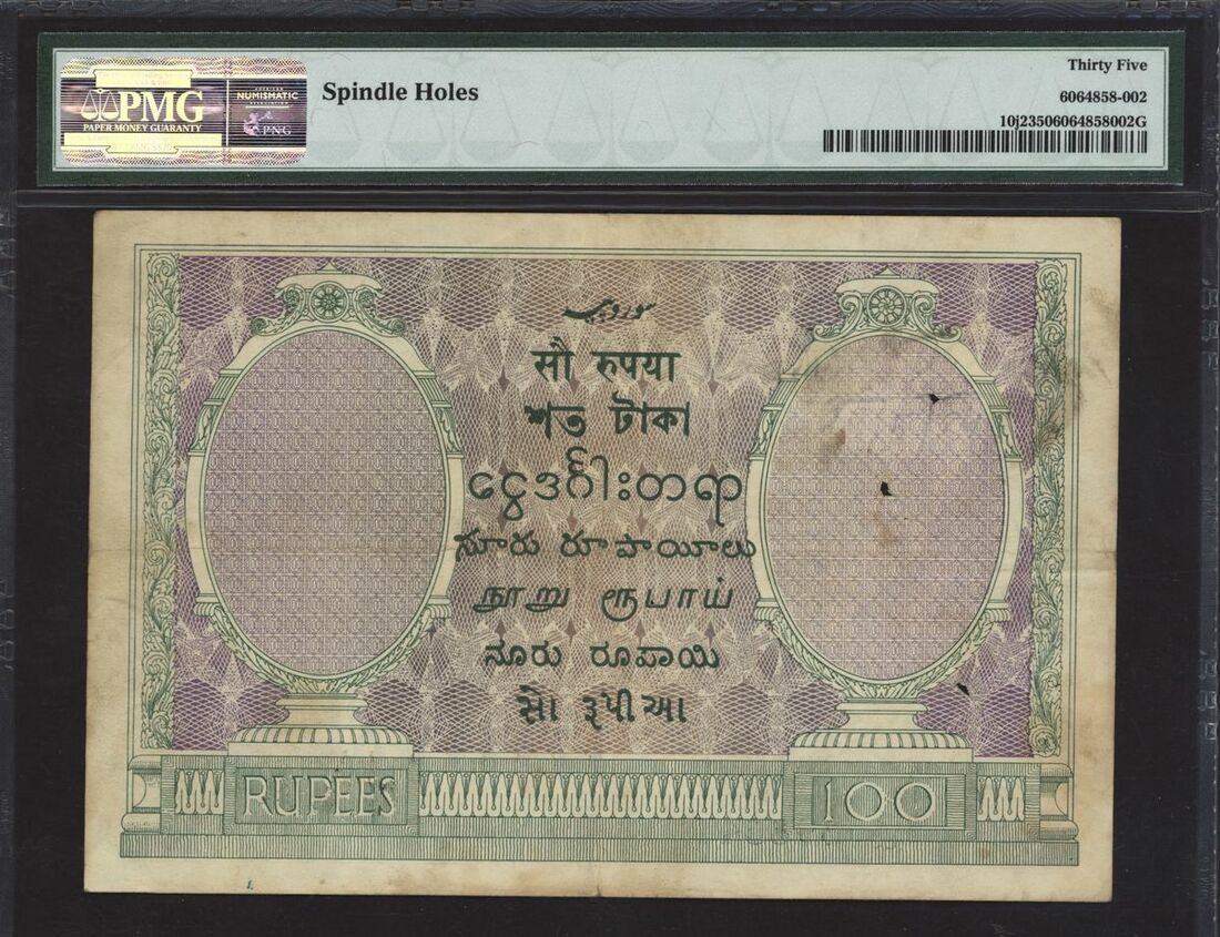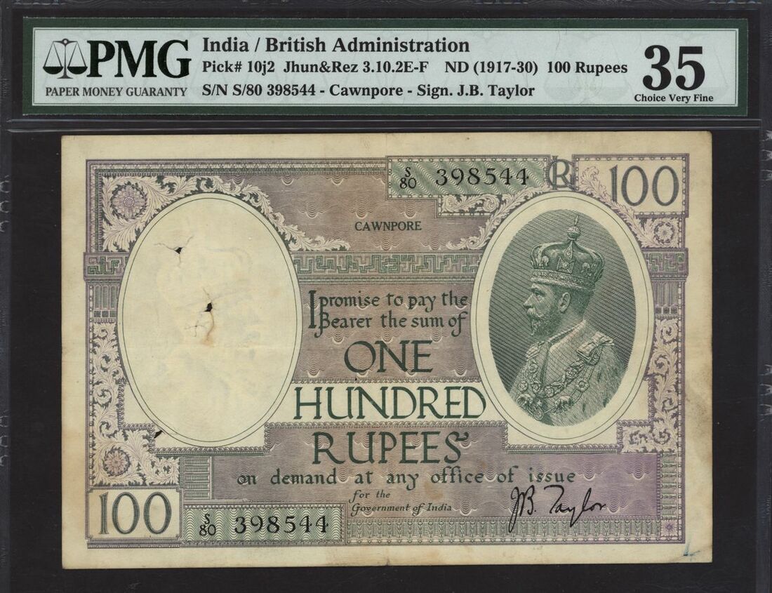 (x) Government of India, [Top Pop] 100 rupees, ND (1917-30), serial number S/80 398544, (Pick 10j2, Razack-Jhunjhunwalla 3.10 2E-F, BNB 144), in PMG holder 35 Choice Very Fine, spindle holes, Cawnpore issue, only 9 notes graded on PMG Census, rare