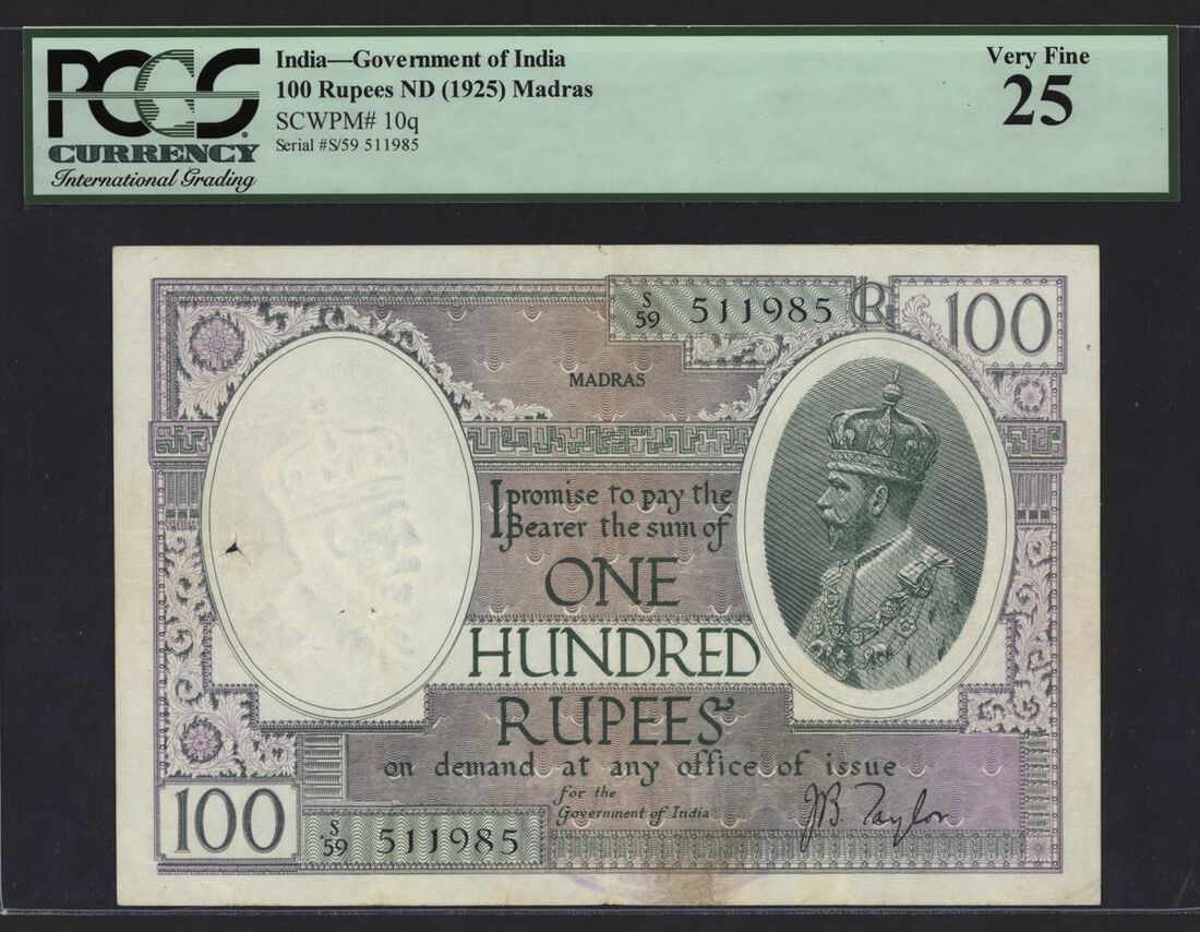 (x) Government of India, 100 rupees, Madras, ND (1926), serial number S/59 511985, signature Taylor,