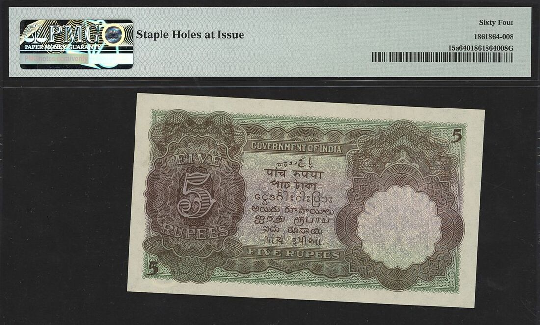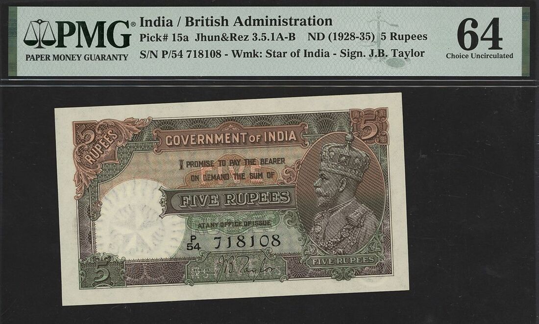 (x) Government of India, 5 rupees, ND (1928-35), serial number P/54 718108, (Pick 15a, Razack-Jhunjhunwalla 3.5.1A-B), in PMG holder 64 Choice Uncirculated, staple holes at issue