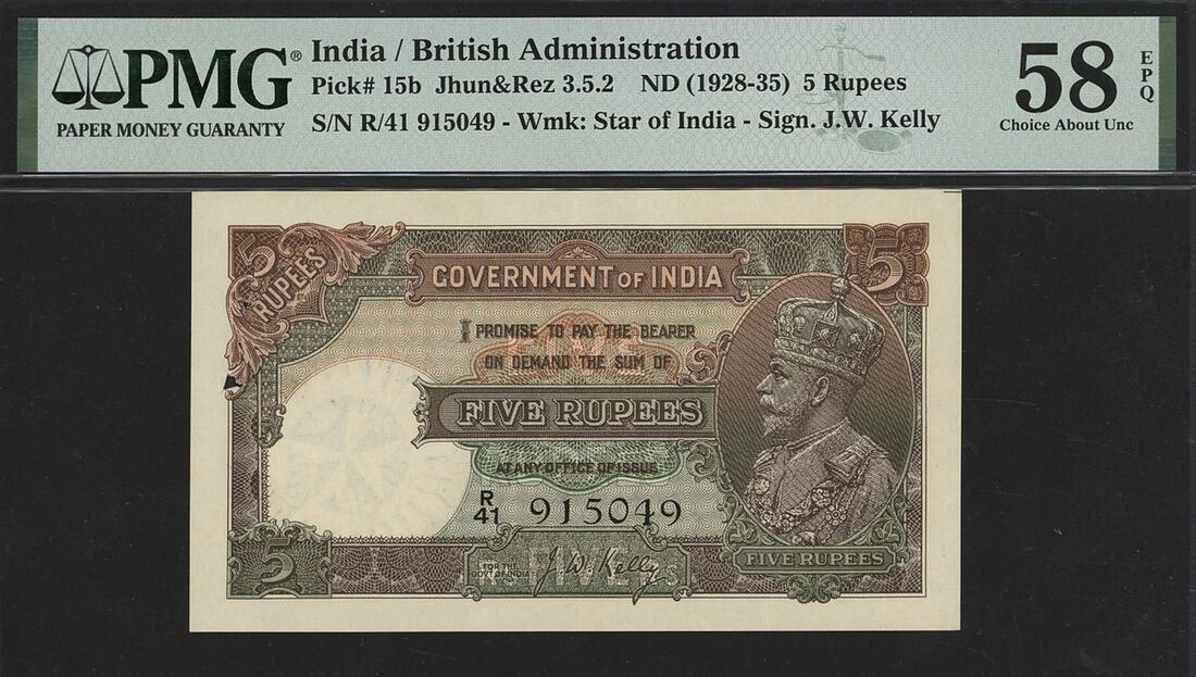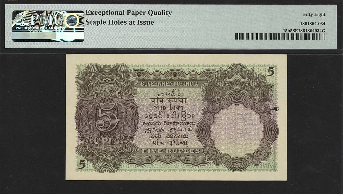 (x) Government of India, 5 rupees, ND (1928-35), serial number R/41 915049, (Pick 15b, Razack-Jhunjhunwalla 3.5.2), in PMG holder 58 EPQ Choice About Uncirculated, staple holes at issue