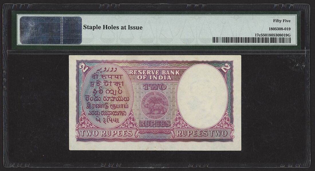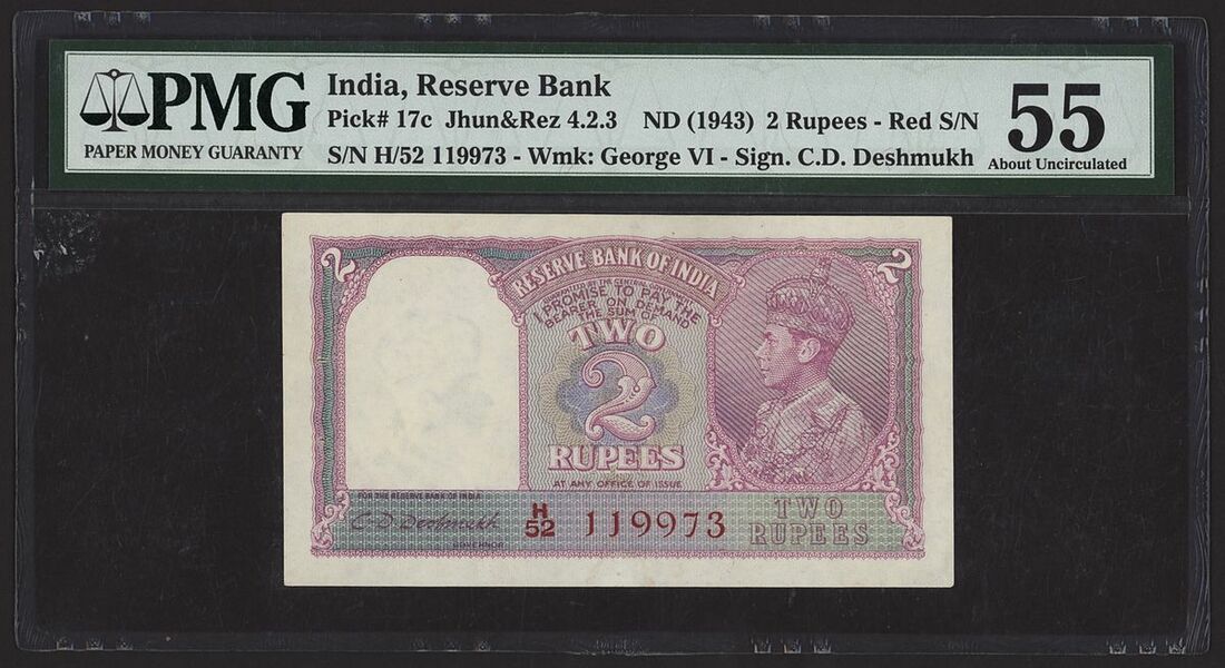 Reserve Bank of India, 2 rupees, ND (1943), serial number H/52 119973, (Pick 17c, Razack-Jhunjhunwalla 4.2.3, BNB 201), in PMG holder 55 About Uncirculated, staple holes at issue