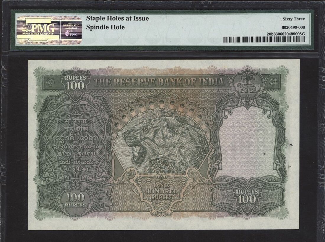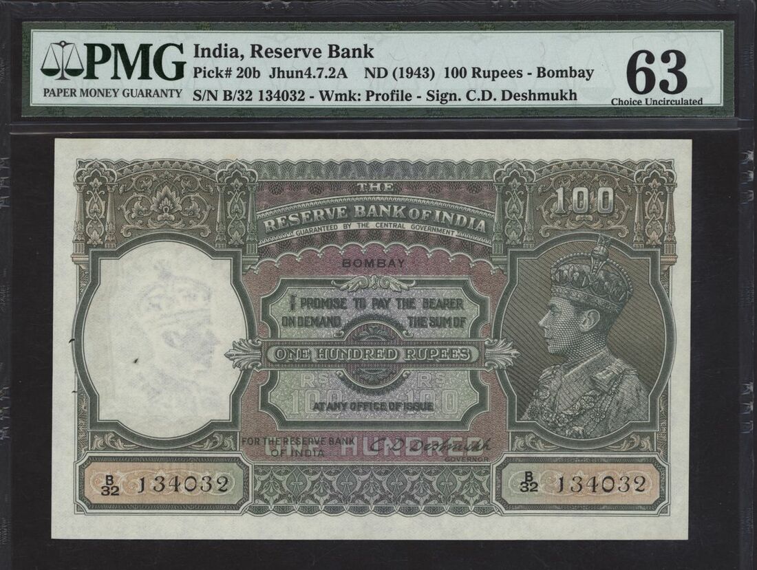 (x) Reserve Bank of India, 100 rupees, ND (1943), serial number B/32 134032, (Pick 20b, Razack-Jhunjhunwalla 4.7.2A, BNB 204), in PMG holder 63 Choice Uncirculated, staple holes at issue, spindle hole