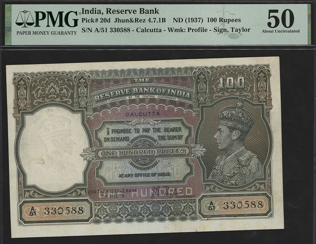 (x) Reserve Bank of India, 100 rupees, ND (1937), serial number A/51 330588, Calcutta Circle