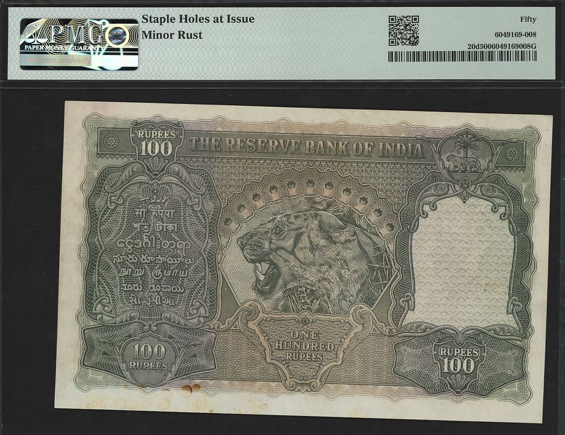 (Pick 20d, Razack-Jhunjhunwalla 4.7.1B), in PMG holder 50 About Uncirculated, staple holes at issue
