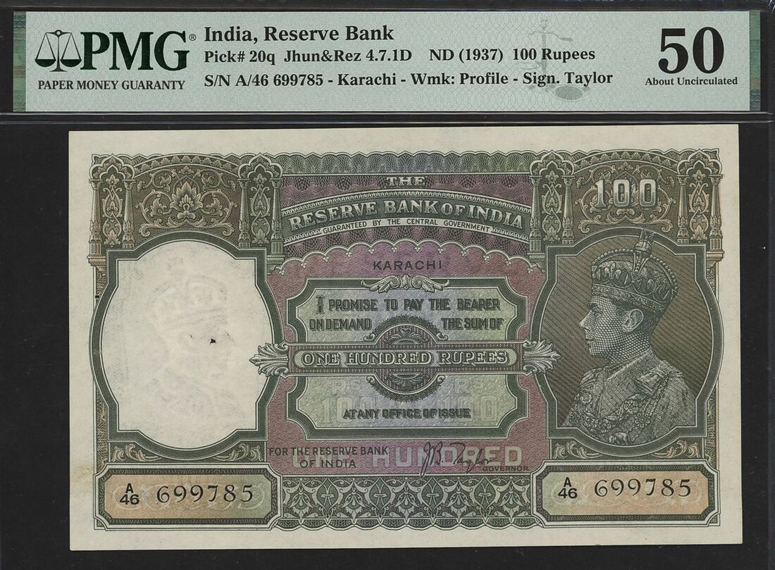 (x) Reserve Bank of India, 100 rupees, ND (1937), serial number A/46 699785, Karachi Circle