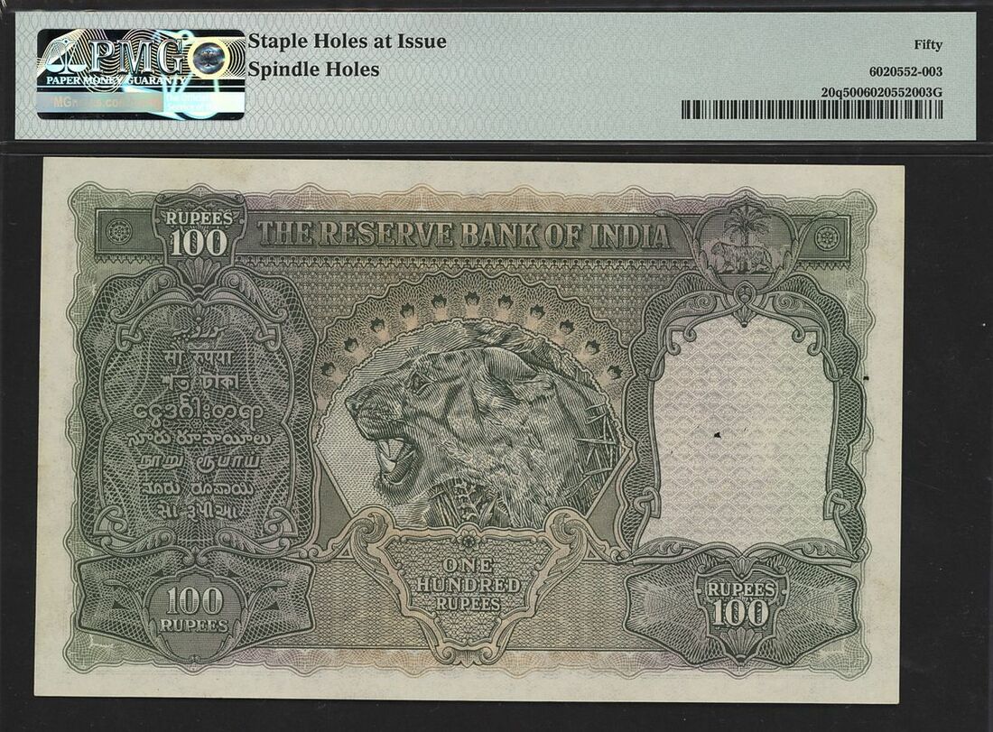 (Pick 20q, Razack-Jhunjhunwalla 4.7.1D), in PMG holder 50 About Uncirculated, staple holes at issue, spindle holes