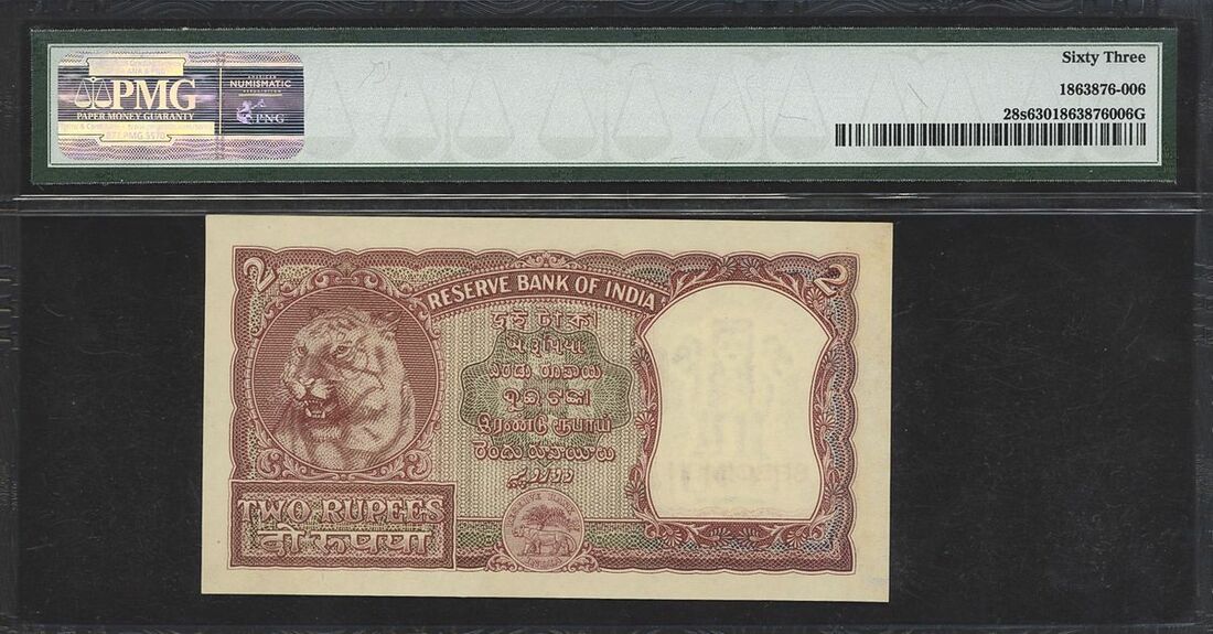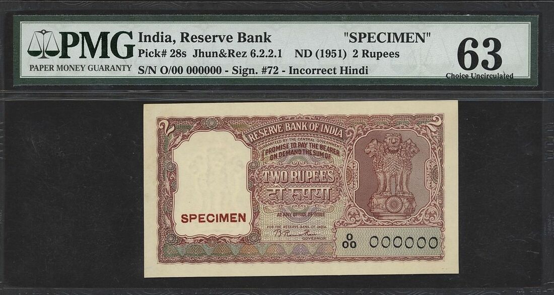 (x) Reserve Bank of India, specimen 2 rupees, ND (1951), serial number O/00 000000, (Pick 28s, Razack-Jhunjhunwalla 6.2.2.1, BNB 210s), in PMG holder 63 Choice Uncirculated, rare
