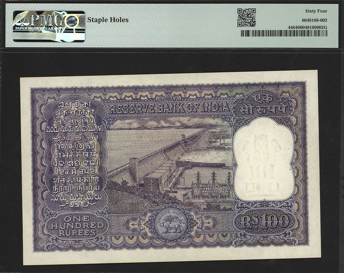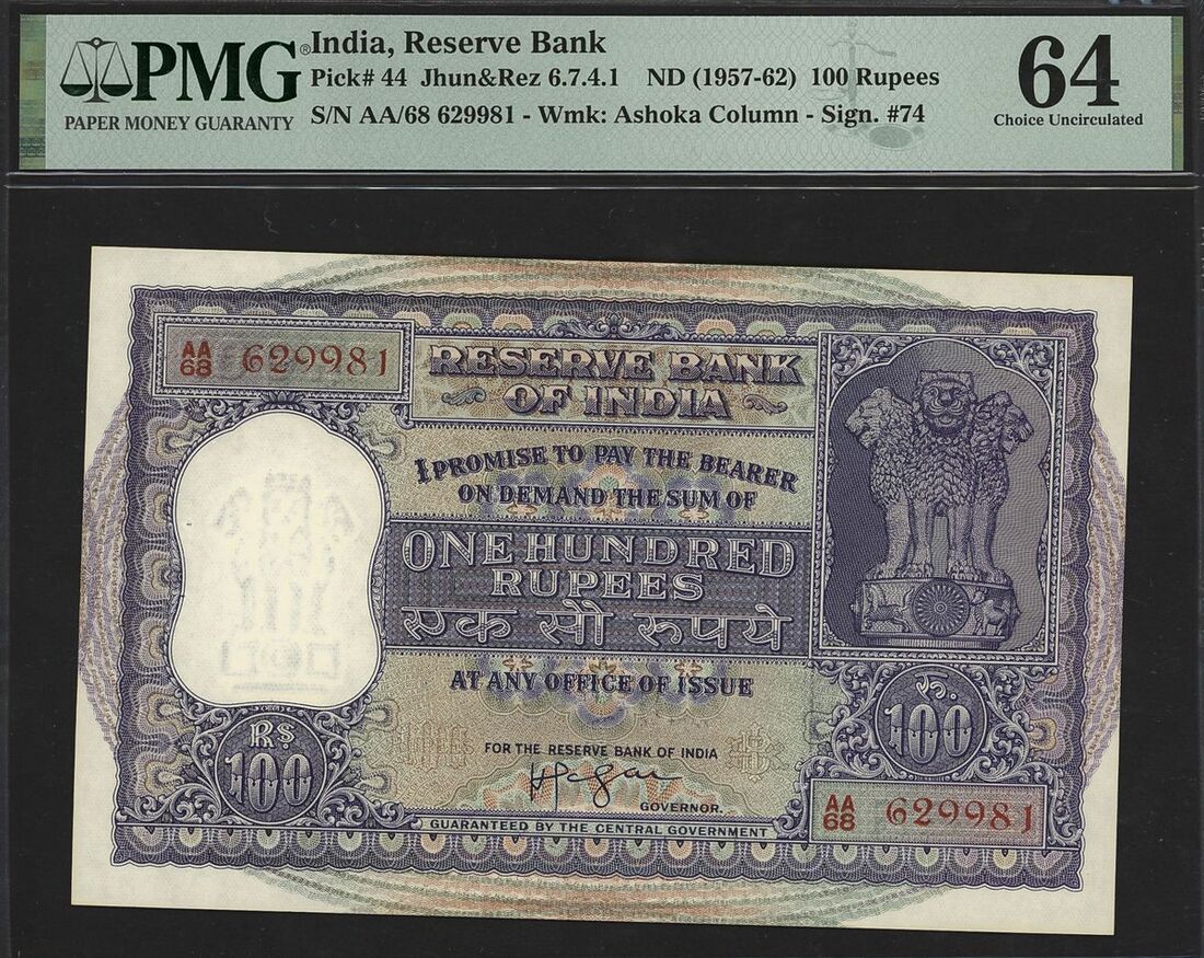 (x) Reserve Bank of India, 100 rupees, ND (1957-62), serial number AA/68 629981, (Pick 44, Razack-Jhunjhunwalla 6.7.4.1), in PMG holder 64 Choice Uncirculated, staple holes