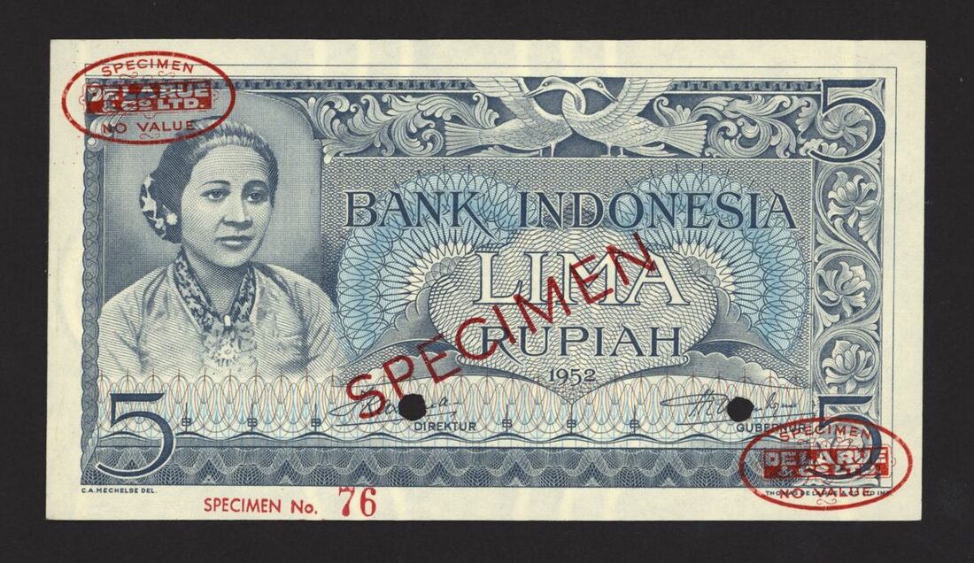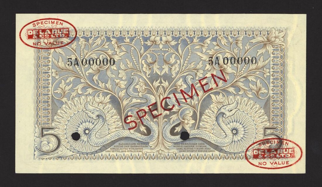 Bank Indonesia, specimen 5 rupiah, 1952, (Pick 42s, BNB 501s), about uncirculated, scarce
