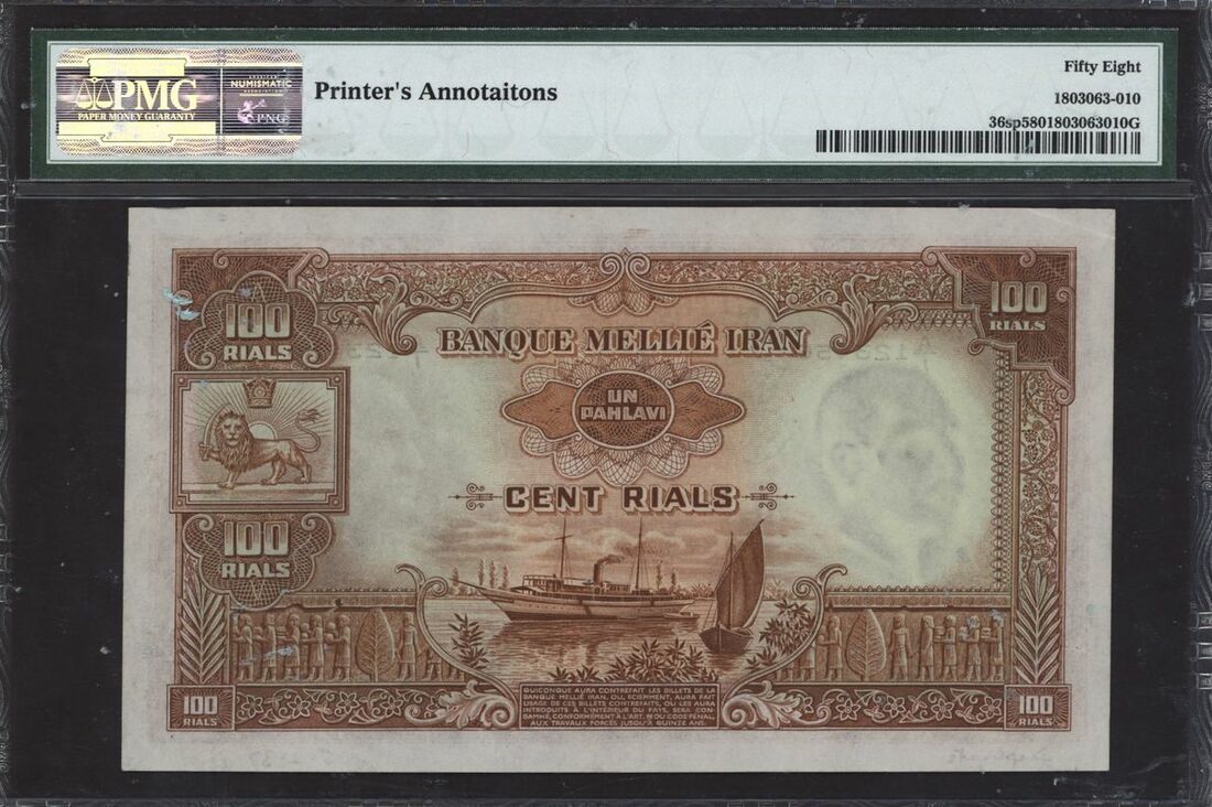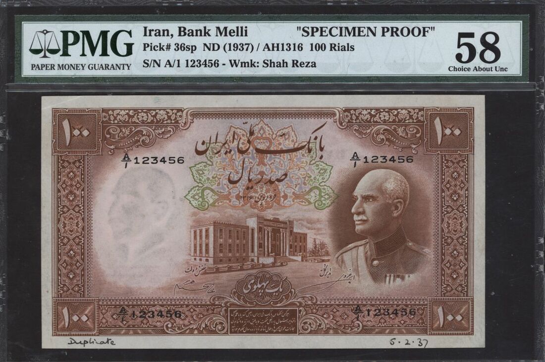 (x) Banque Mellie Iran, specimen proof 100 riyals, ND (1937), ascending ladder serial number A/1 123456, (Pick 36sp, BNB 120s), in PMG holder 58 Choice About Uncirculated