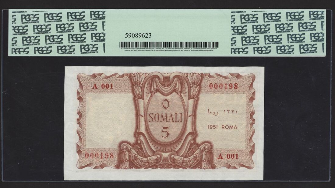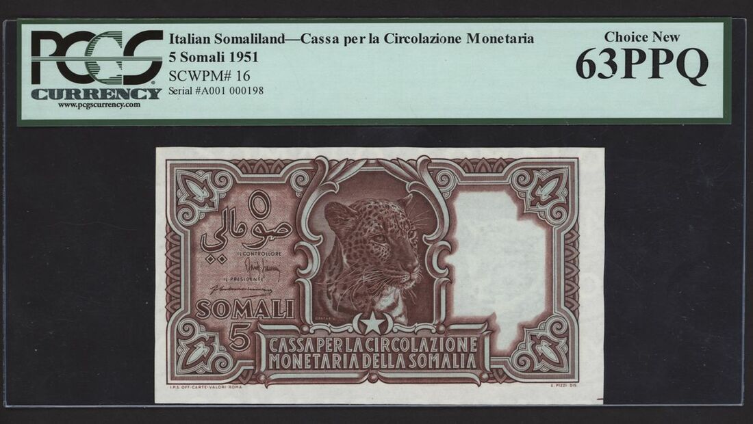 (x) Cassa per la Circolazione Monetaria della Somalia, Italian Somaliland, 5 somali, 1951, red serial number A001 000198, red-brown, leopard at centre, value at left, Clancimino and Giannini, reverse red-brown, value and serial numbers in red