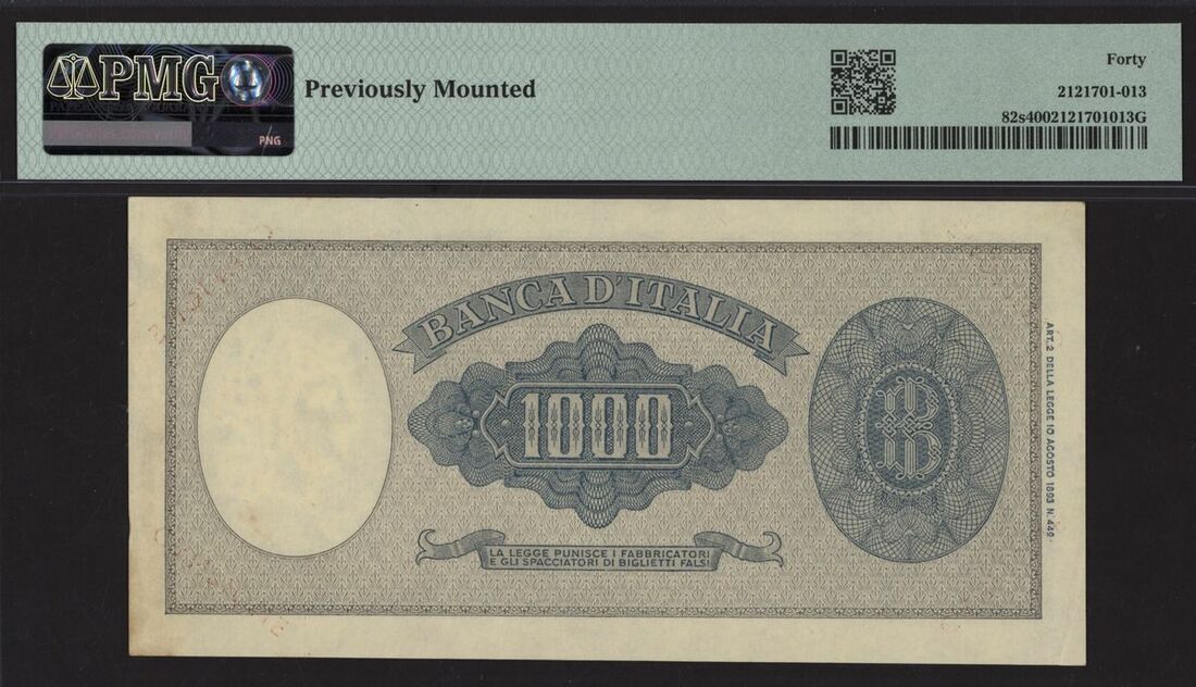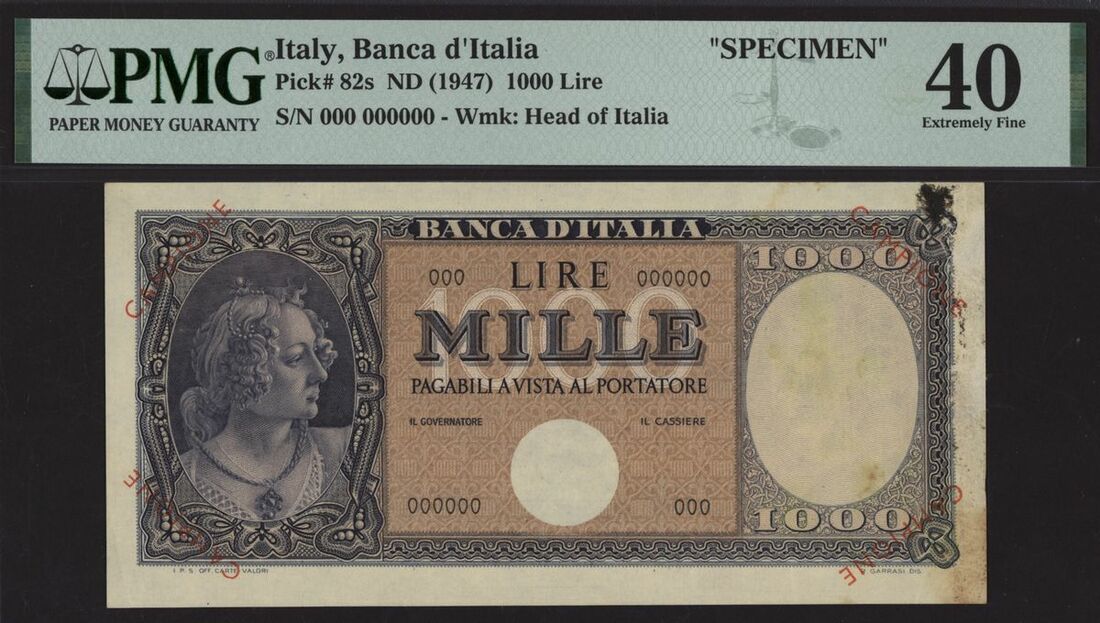 (x) Banca d'Italia, Italy, specimen 1000 lire, ND (1947), serial number 000 000000, (Pick 82s, BNB 440s), in PMG holder 40 Extremely Fine, previously mounted, scarce