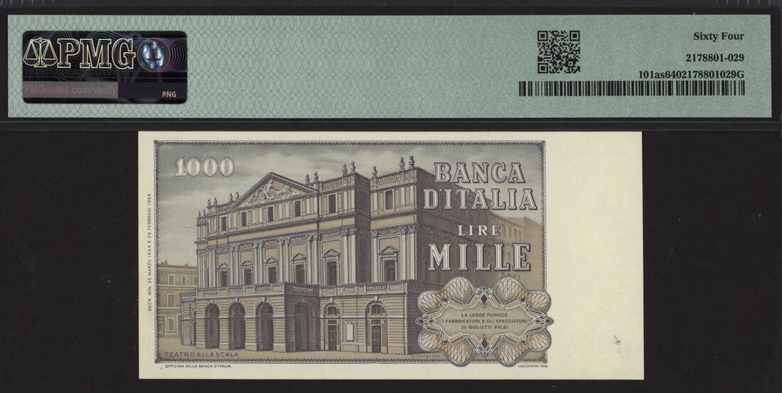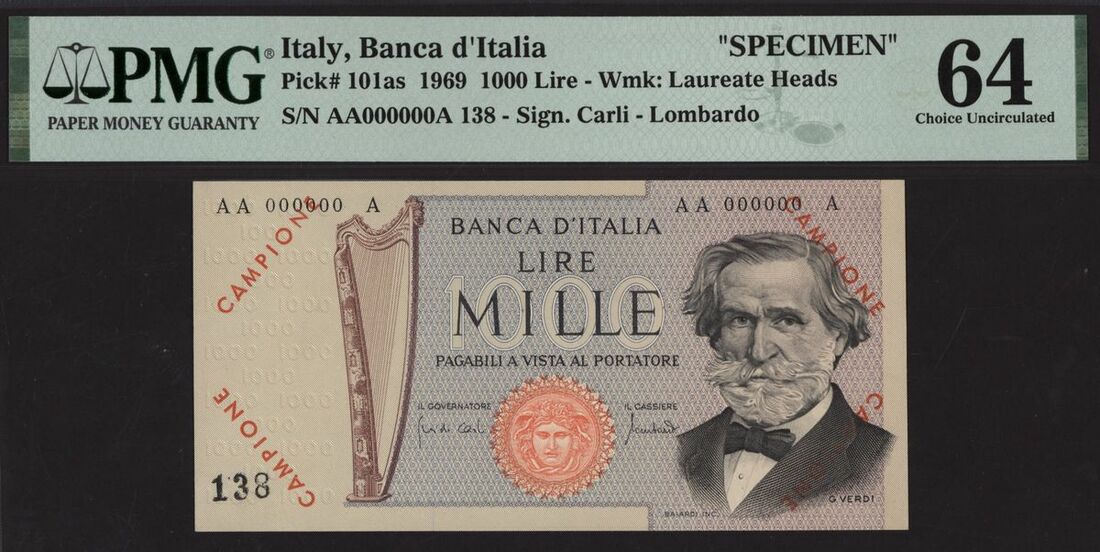 (x) Banca d'Italia, Italy, specimen 1000 lire, 1969, serial number AA000000A 138, (Pick 101as, BNB 448s), in PMG holder 64 Choice Uncirculated, only 1 note in a higher grade