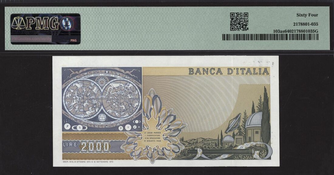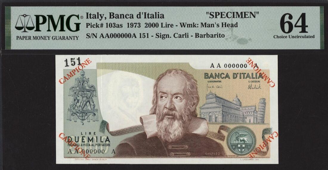 (x) Banca d'Italia, Italy, [Top Pop] specimen 2000 lire, 1973, serial number AA000000A, (Pick 103as, BNB 453s), in PMG holder 64 Choice Uncirculated, rare
