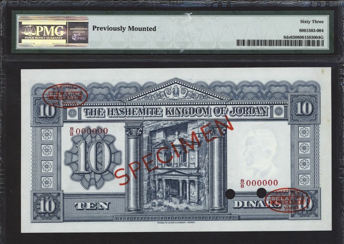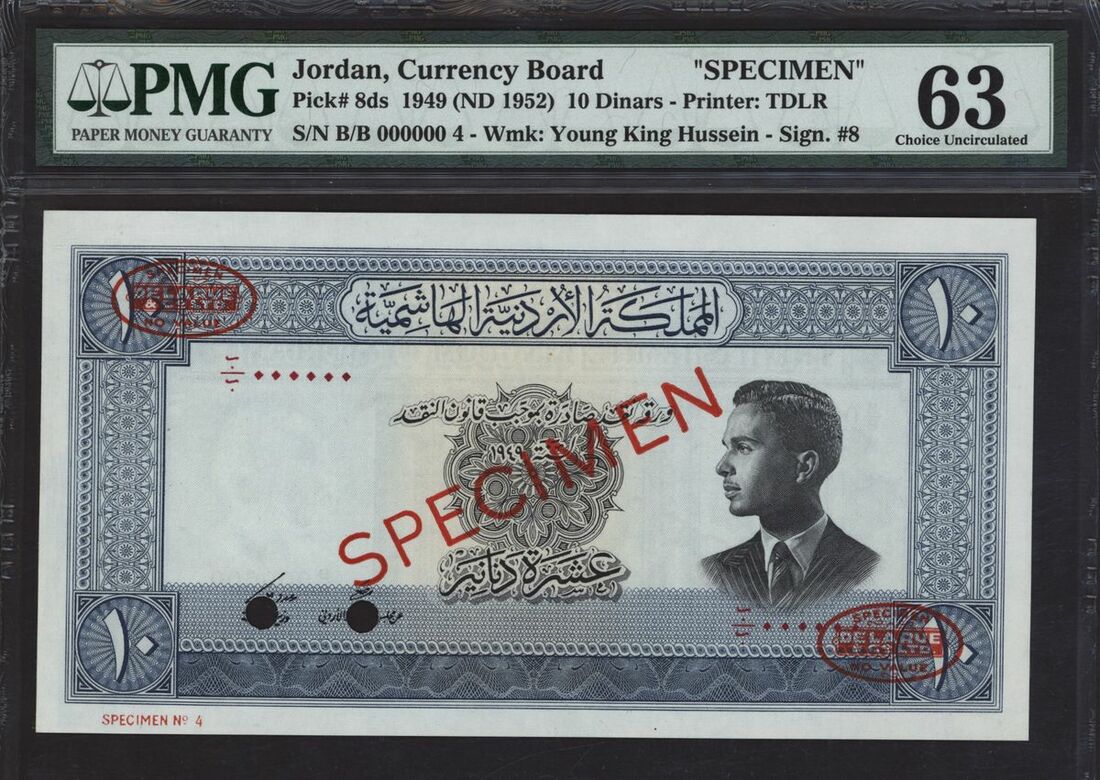 (x) Hashemite Kingdom of Jordan, specimen 10 dinars, 1949 (ND 1952), serial number B/B 000000 4, (Pick 8ds, BNB 109s), in PMG holder 63 Choice Uncirculated, previously mounted