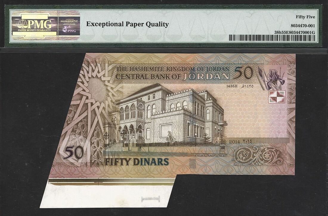 (x) Central Bank of Jordan, error 50 dinars, 2014, serial number SR388775, (Pick 38h, BNB 234), in PMG holder 55 EPQ About Uncirculated, printing error
