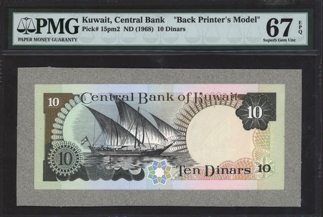 (x) Central Bank of Kuwait, unissued design reverse composite essay on card for a 10 Dinar, ND (1968), blue and ping on multi-coloured underprint (issued green), English text, dhow at sea with three sails and flag