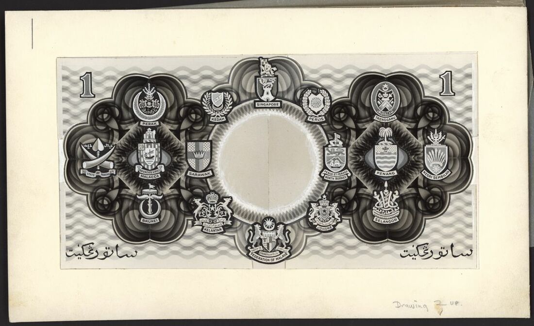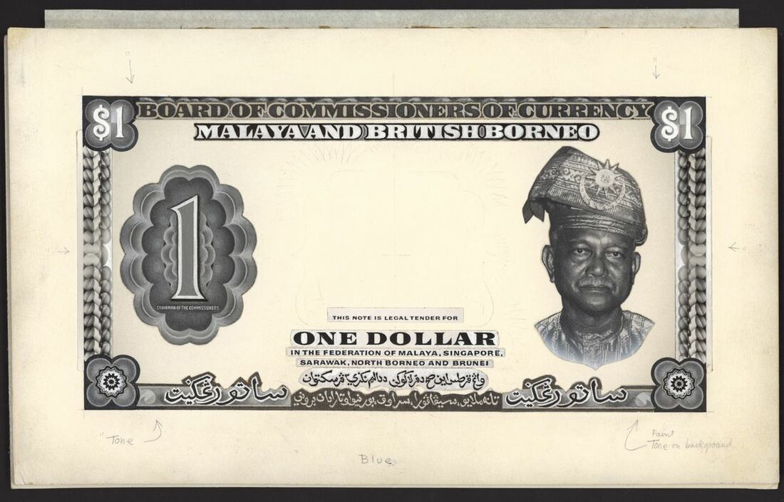 Board of Commissioners of Currency, Malaya and British Borneo, Harrison and Sons composite presentational essay, $1, ND (1962), (Goon second edition, 2015, p.309, Tan MBB 8 - for type), some parts slightly unstuck due to the age and type of glue, beautiful and striking, most likely unique (3 pieces)