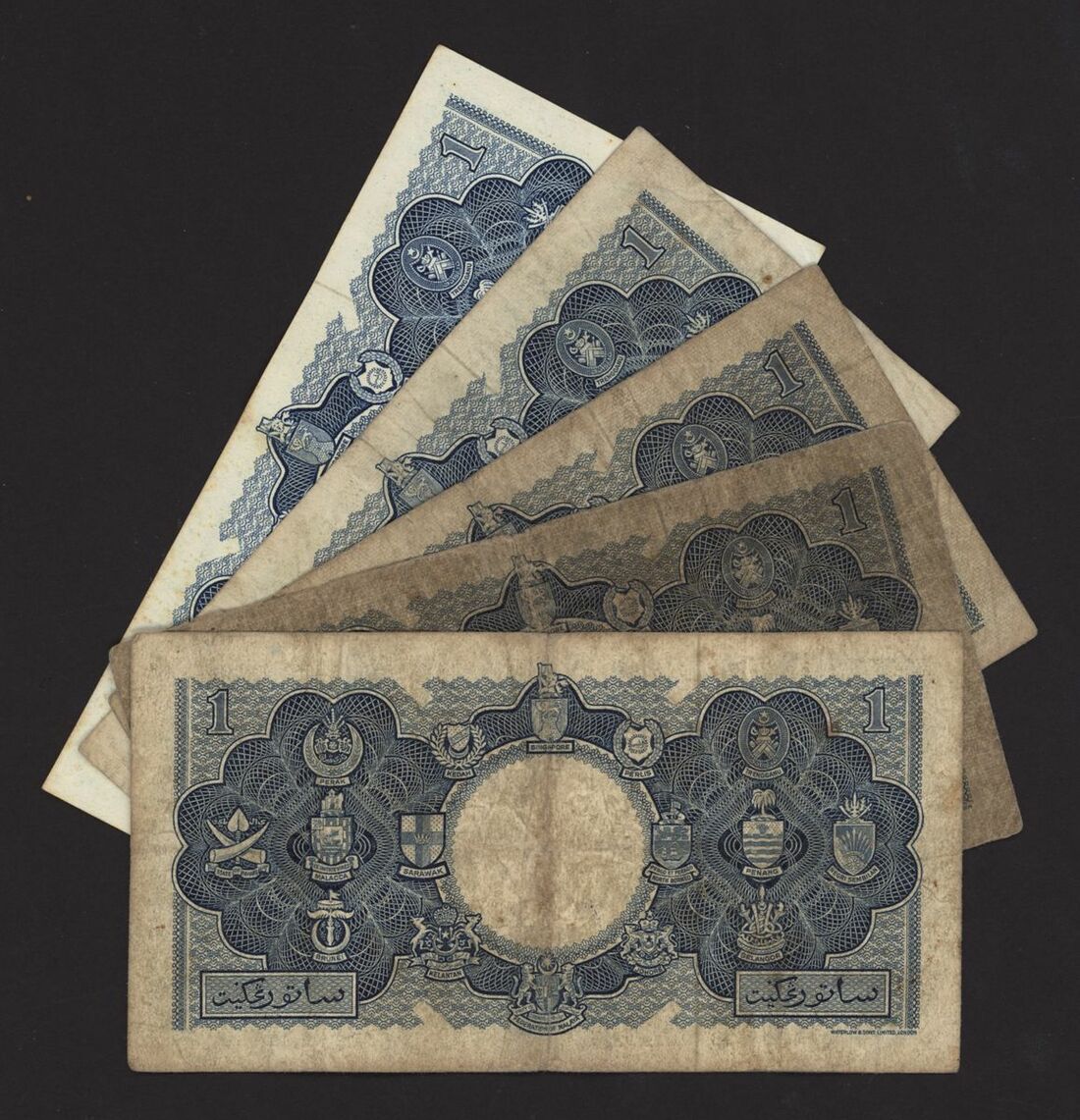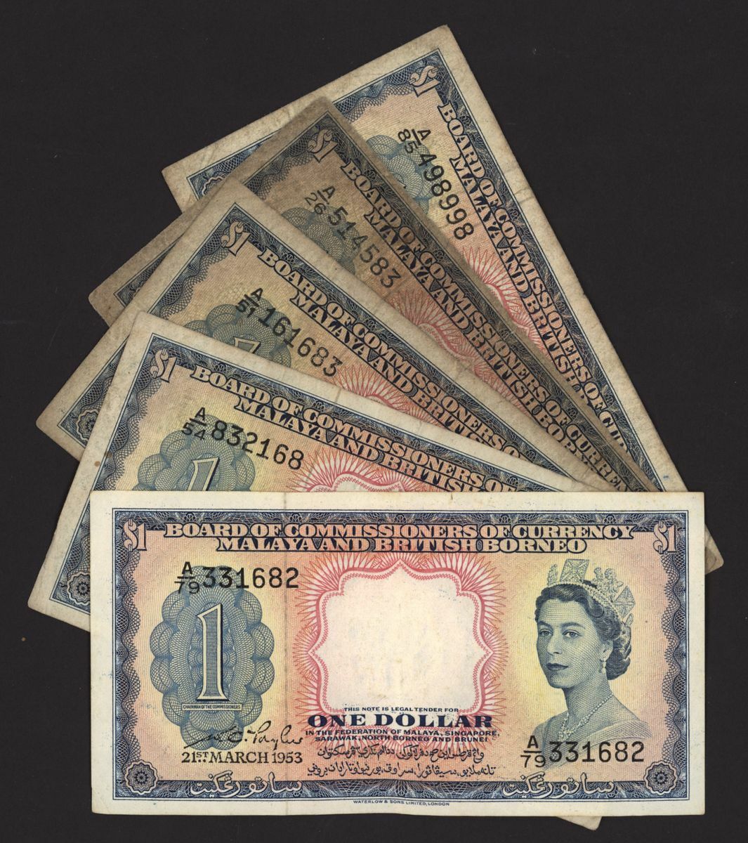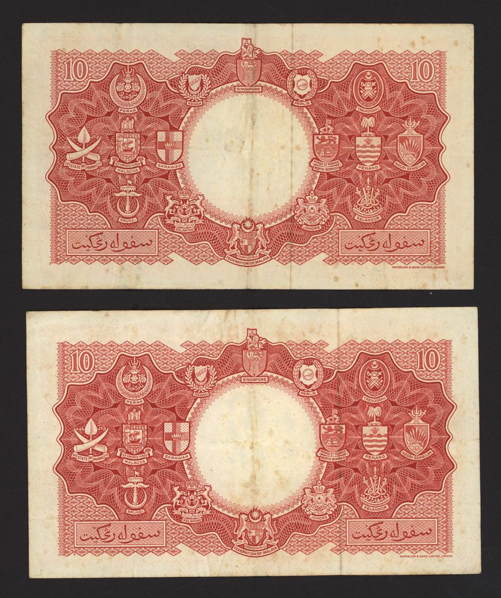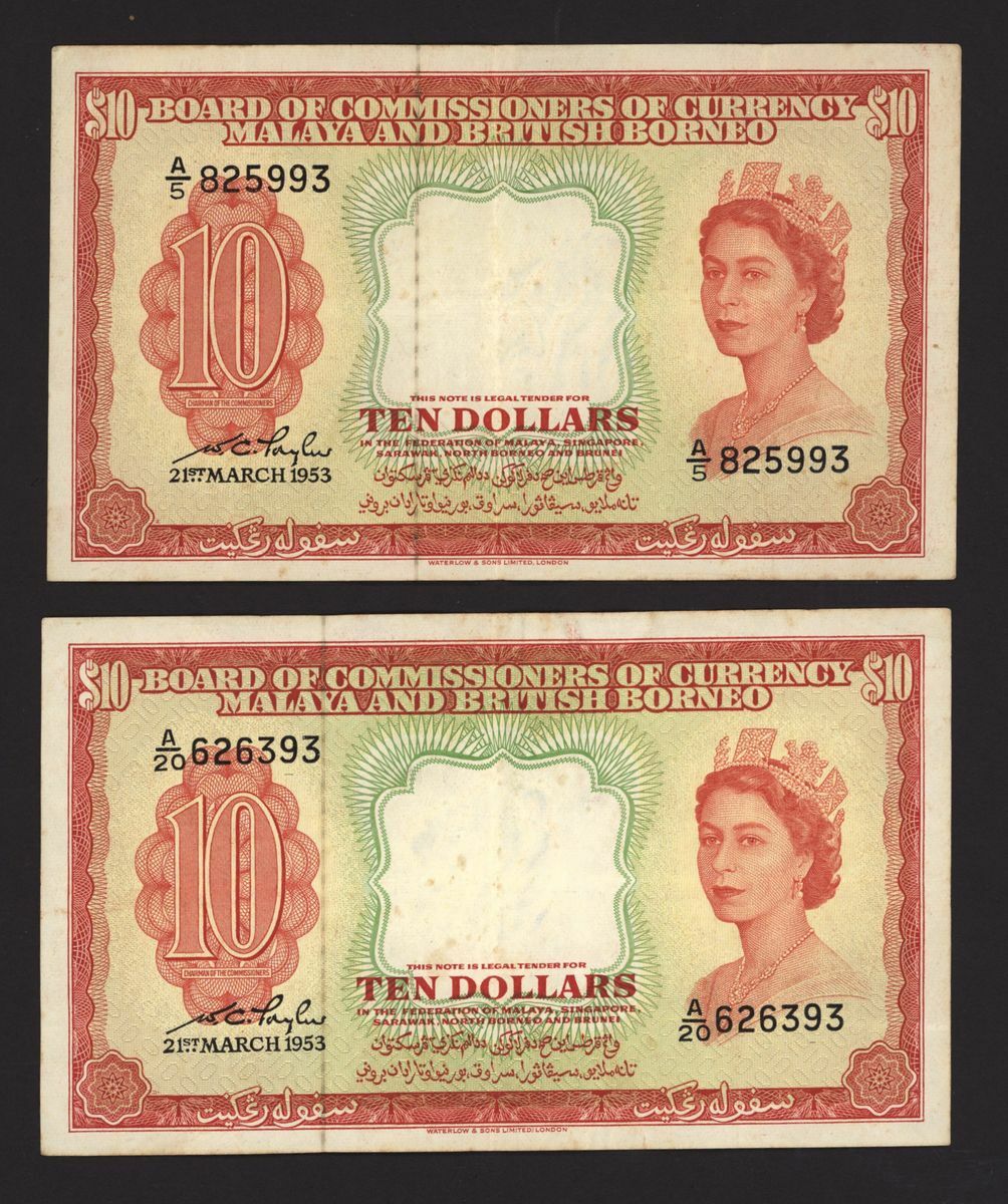 Malaya and British Borneo, $10 (2 notes), $1 (5 notes), 1953, (Pick 3, 1, BNB 103, 101), $10 very fine, $1 fine to very fine (7 notes)