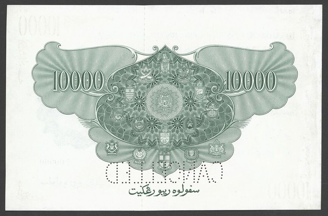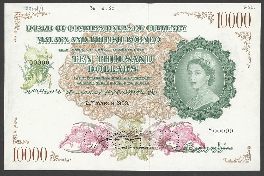 Board of Commissioners of Currency , Malaya and British Borneo, specimen $10,000, 21st March 1953, serial number A/1 00000, Queen Elizabeth II at right