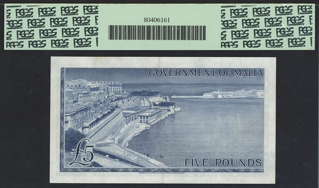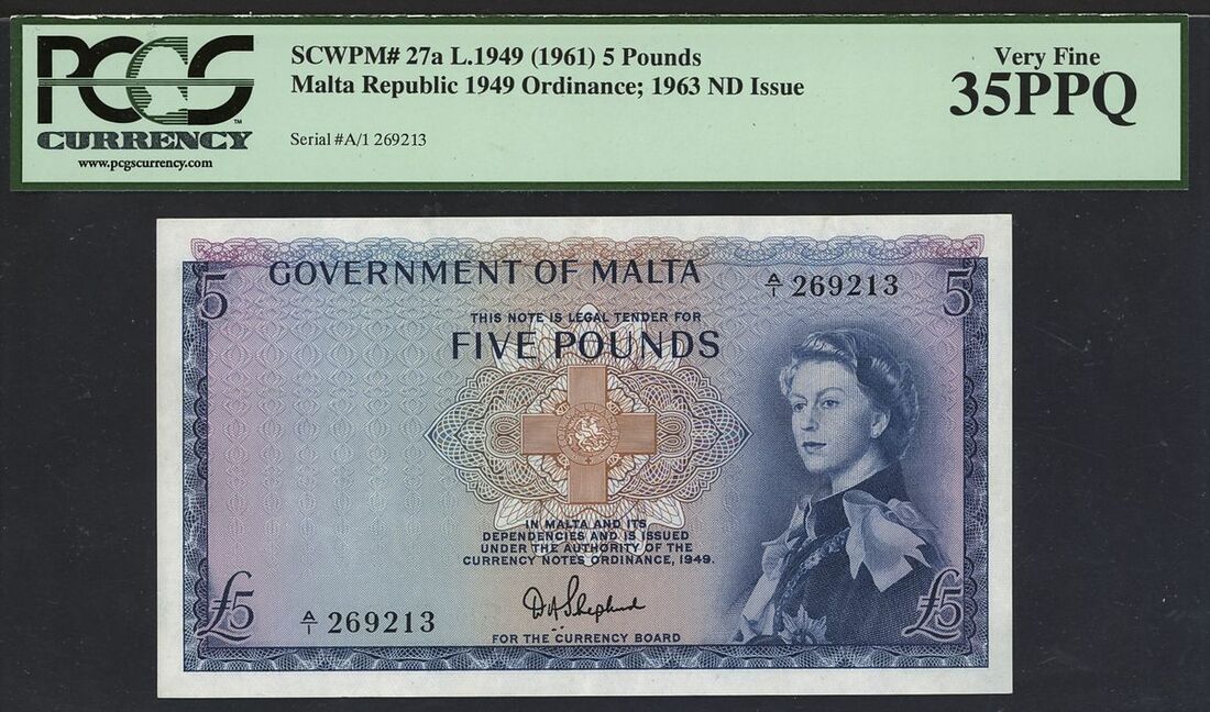 Government of Malta, £5, 1949, serial number A/1 269213, (Pick 27a), in PCGS holder 35PPQ Very Fine