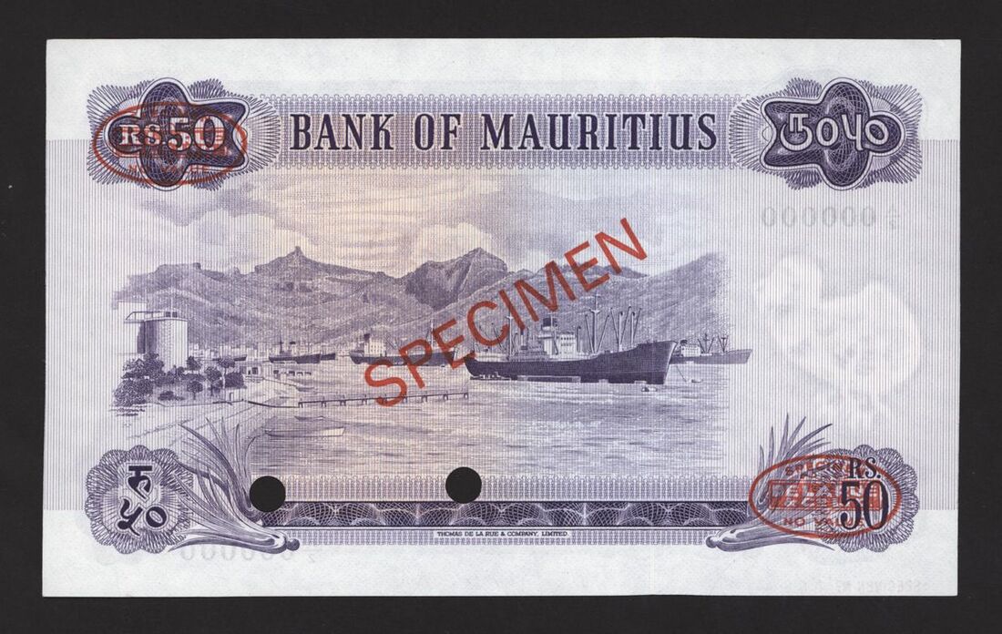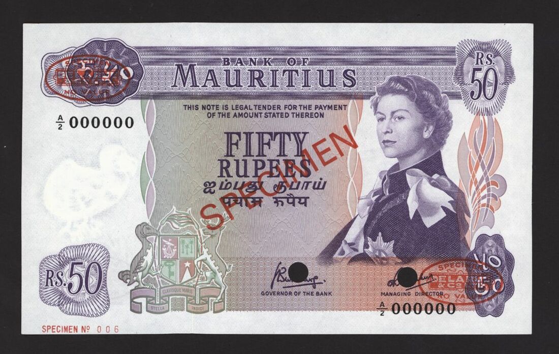 (x) Bank of Mauritius, specimen 50 rupees, ND (1967), serial number A/2 000000, (Pick 33as, BNB 404s), punched, uncirculated