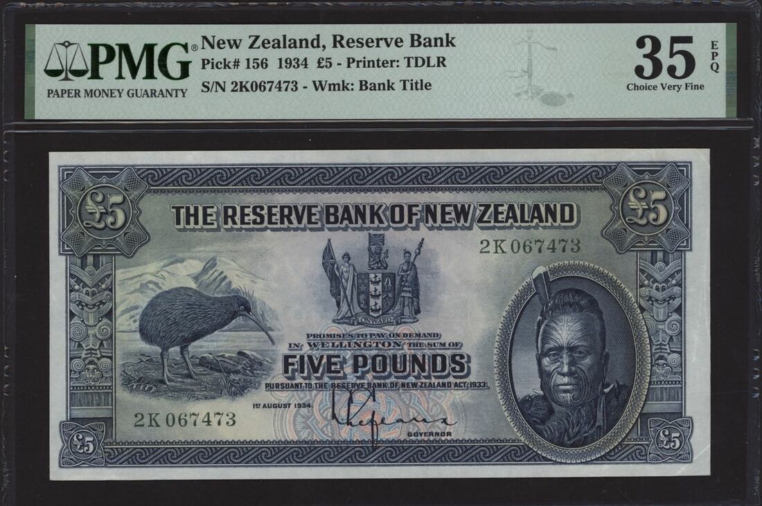 Reserve Bank of New Zealand, £5, 1934, serial number 2K 067473, (Pick 156a, BNB 103), in PMG holder 35 EPQ Choice Very Fine