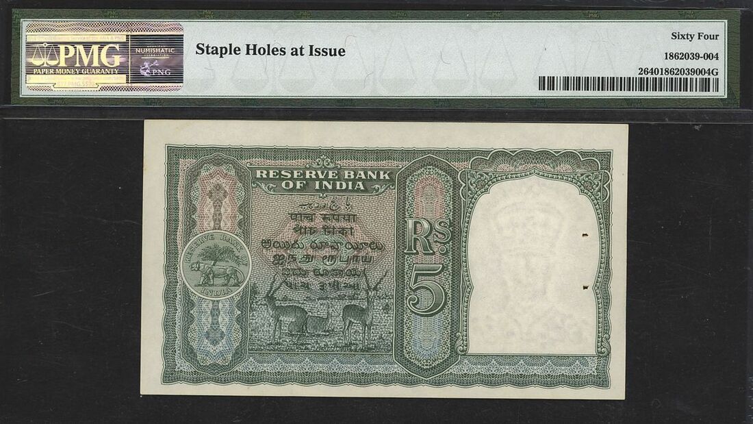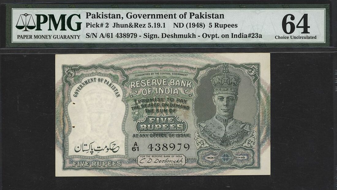 (x) Government of India, Pakistan, [Top Pop] 5 rupees, ND (1948), serial number A/61 438979, (Pick 2, Jhun&Rez 5.19.1, BNB 103), in PMG holder 64 Choice Uncirculated, staple holes at issue