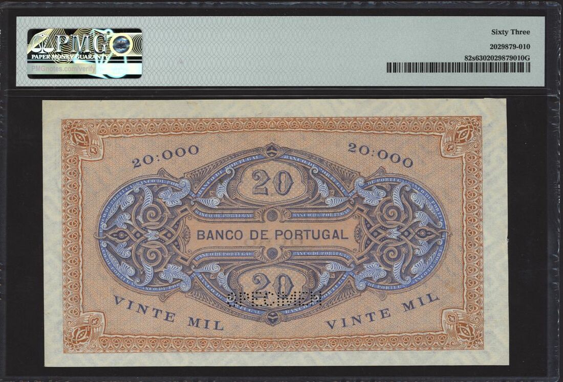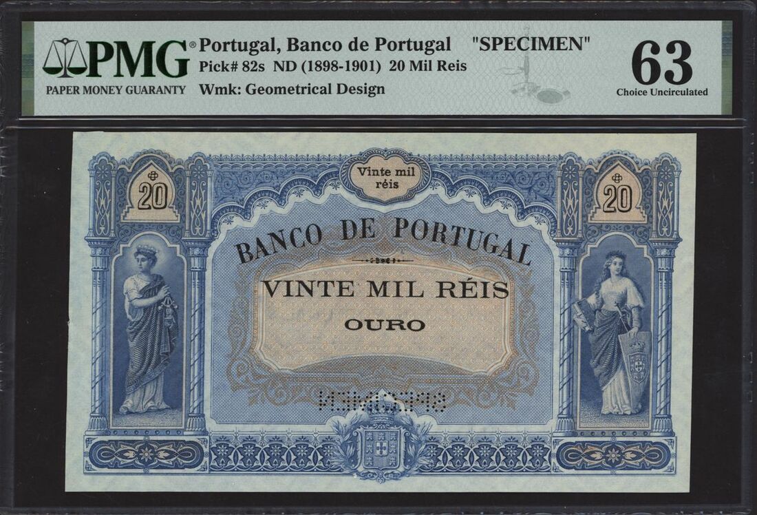 (x) Banco de Portugal, a printers archival proof 20 mil reis, ND (1901), without serial numbers, blue and orange, allegorical classical female figure at left and right, value in pale orange guilloche at centre, reverse blue, D.Affonso Henriques at centre, helmeted female profile at left and right