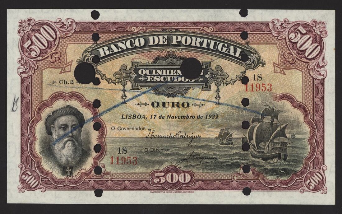 Banco de Portugal, Reis Spurious Issue, 500 escudos, 17 November 1922, Ch 2, red serial number 1S 11953, purple, pale yellow and green, Vasco de Gama at left, galleons right centre, reverse purple, arms at centre, value at left and right
