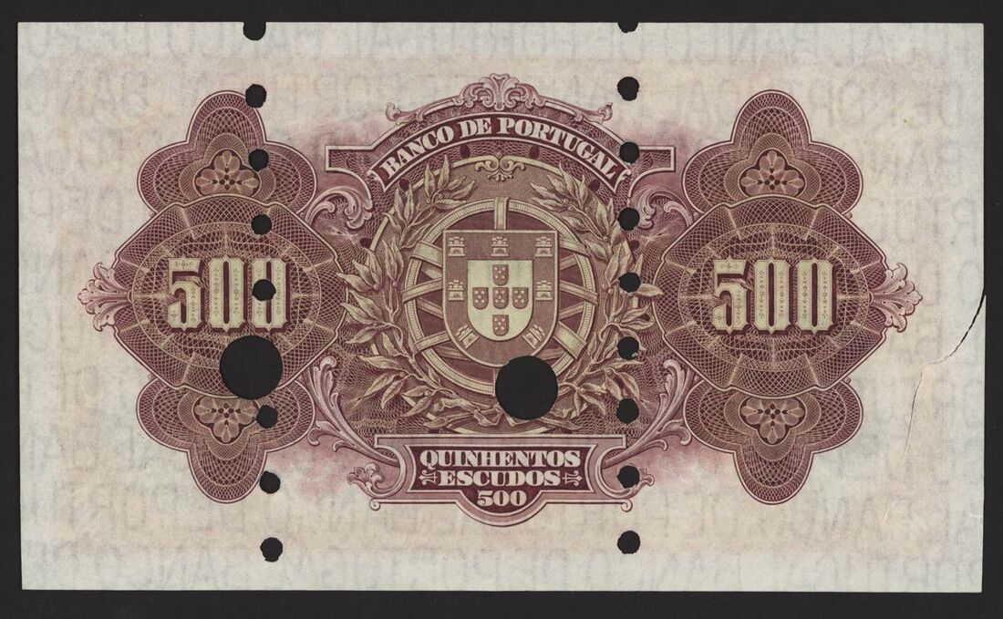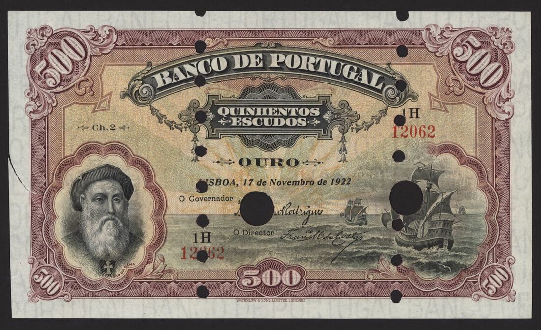 Banco de Portugal, Reis Spurious Issue, 500 escudos, 17 November 1922, Ch 2, red serial number 1H 12062, purple, pale yellow and green, Vasco de Gama at left, galleons right centre, reverse purple, arms at centre, value at left and right